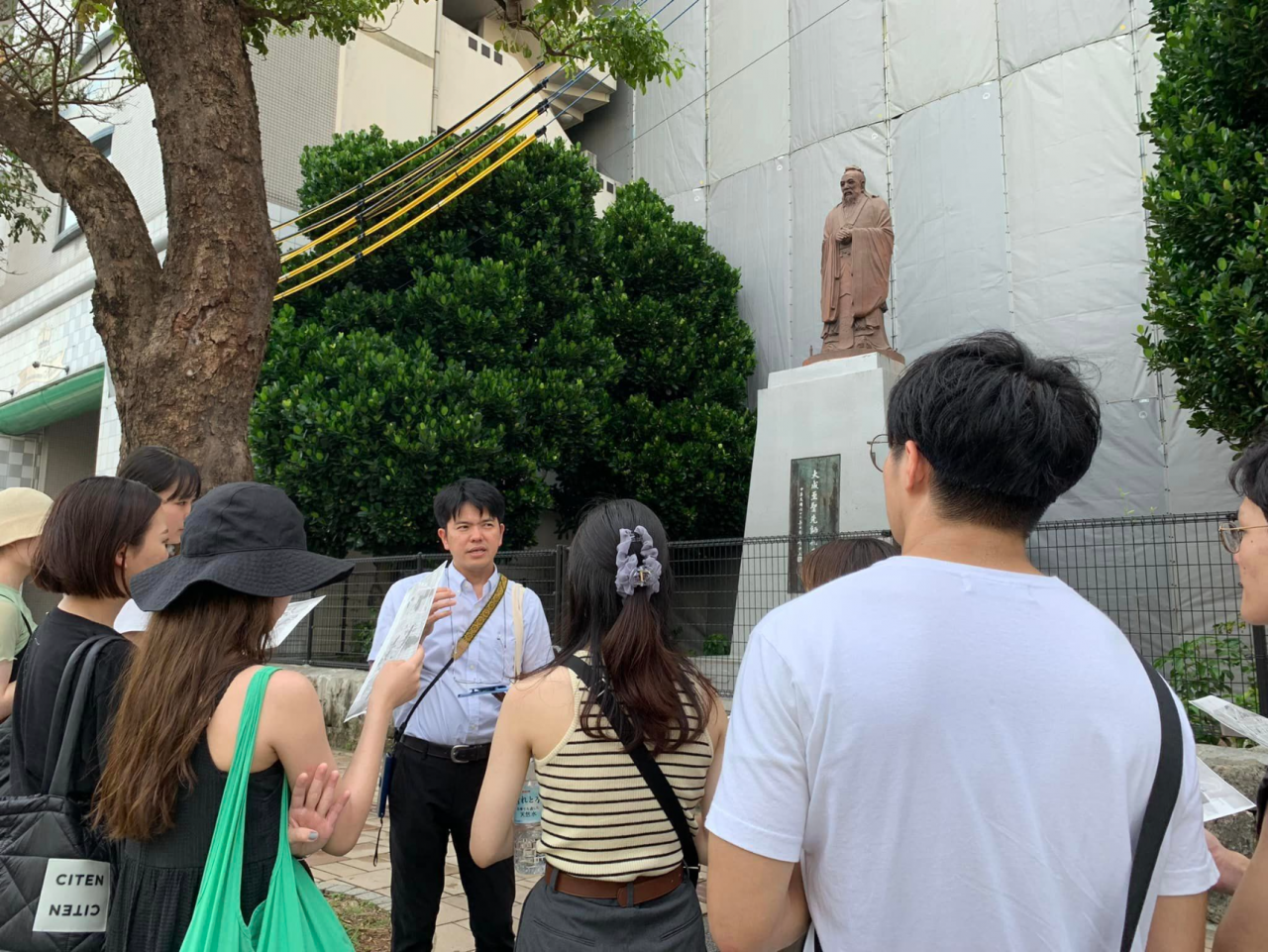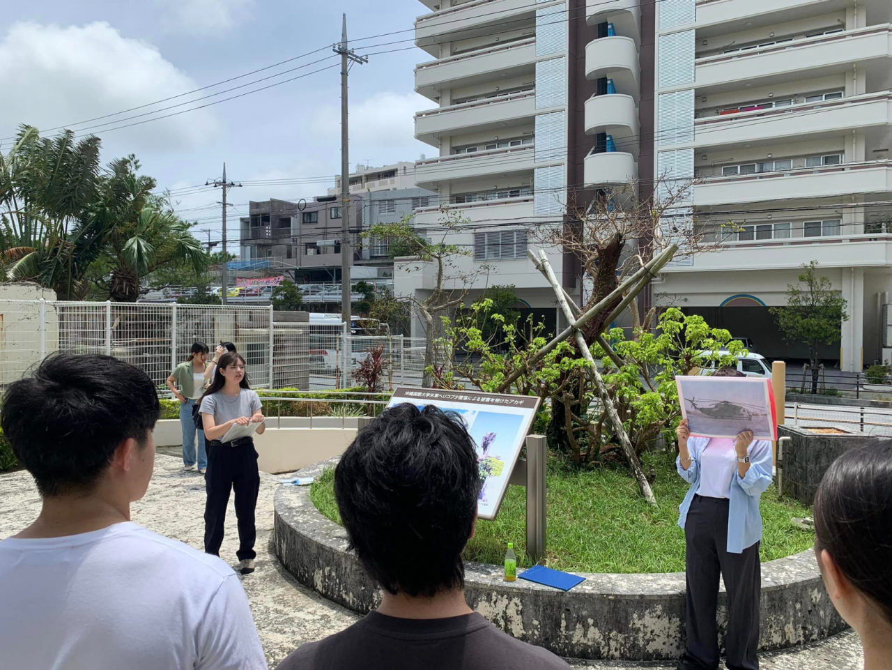 台風のため2日遅れでキックオフの沖縄スタディーツアー 伊丹空港から神戸空港発の便に振替で8日の午後8時ごろに那覇に到着しました。 翌日9日は沖縄国際大学の石垣先生の琉球王国と中国の関係について現在の県庁近くにある旧浮島に中国から移住した方々が住んだ久米村のお話、 午後は石垣ゼミの学生による沖縄国際大学と普天間米軍基地についてやヘリコプターの墜落事故などについて、その現場からお話をして頂きました。 その後那覇市内に戻り石垣先生から孔子廟や久米村でのミニFWをして頂きました。