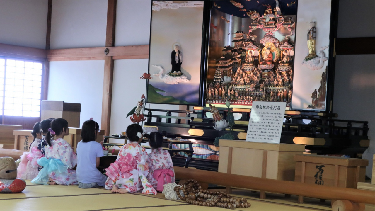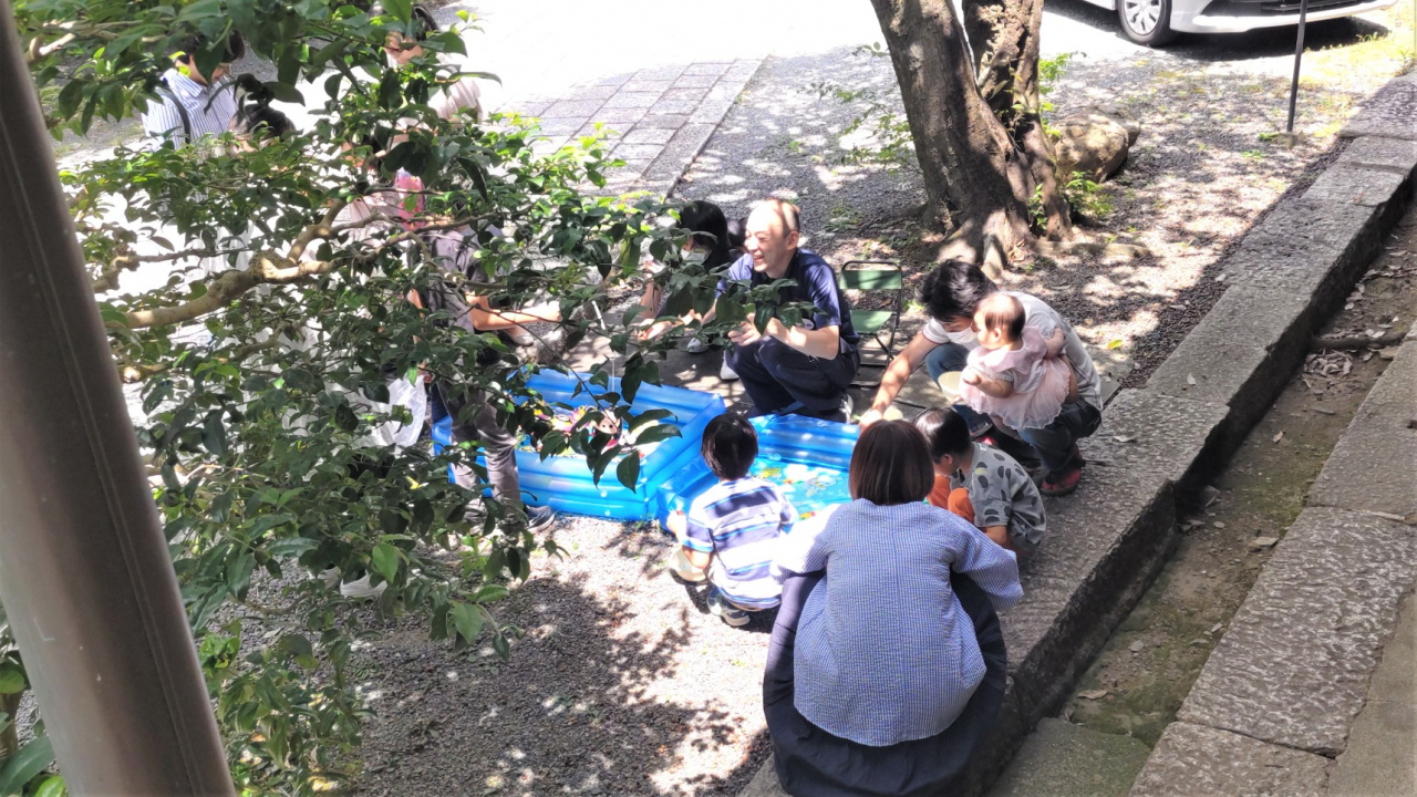 今回、参加させていただいたのは日曜日の教室であったため、0歳児の赤ちゃんから小学3年生までのお子さんたち20名程がご両親とともに参加されていました。当日は「地蔵盆」ということで、数珠繰りや縁日が実施されていたため、甚平や浴衣姿で参加するお子さんたちが多く、にぎやかな雰囲気でした。