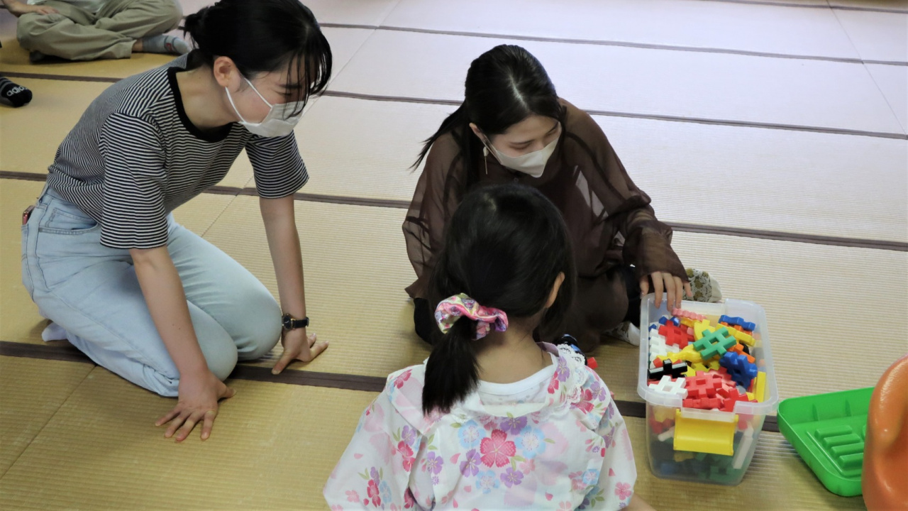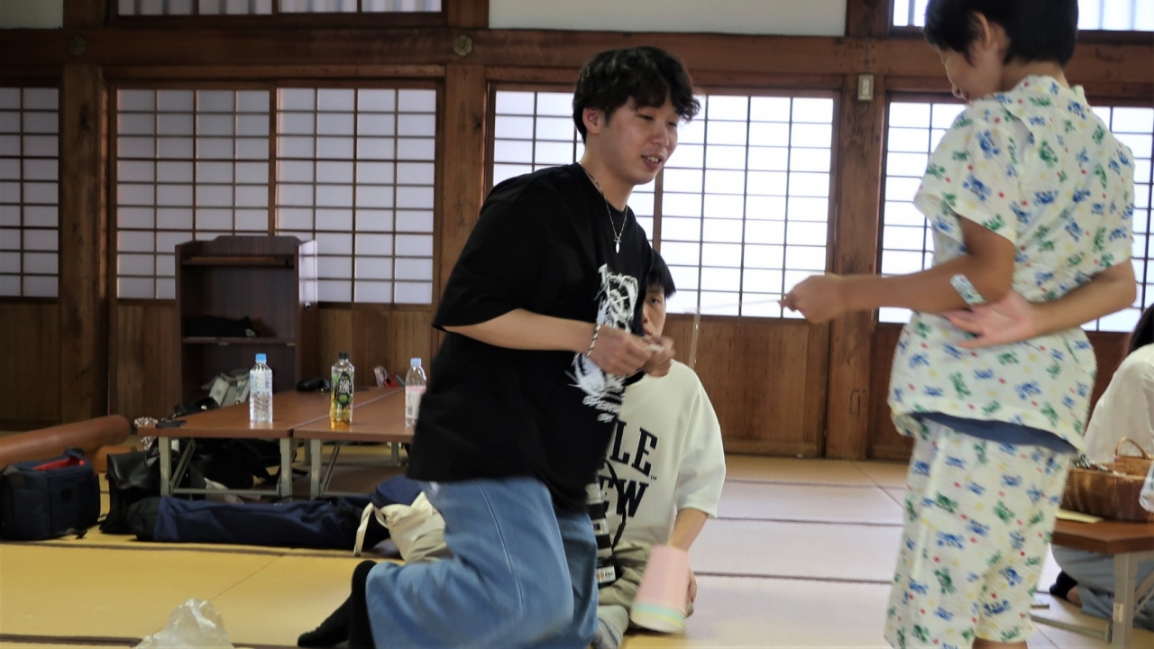 そのあとは皆で輪になって大きな数珠で数珠繰り。受講生たちはその様子を見学させていただきました。いよいよお楽しみの縁日です。事前に先生方がご準備された楽しい出し物が11もあり、手作りのチケットを握りしめて、チケットと交換で、お堂の中ではパズルや工作、ペットボトルボーリングや紙コップ魚釣り、駄菓子屋さん、外ではヨーヨー釣りなど、盛りだくさんの内容で子どもたちもワクワクしながら回っていました。受講生たちは、先生たちのお手伝いとして、お店の番をしながら子どもたちとも交流させて頂く事が出来ました。