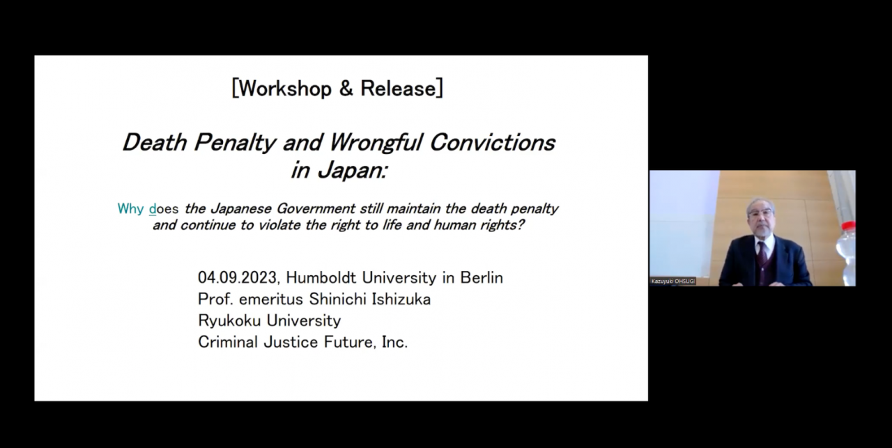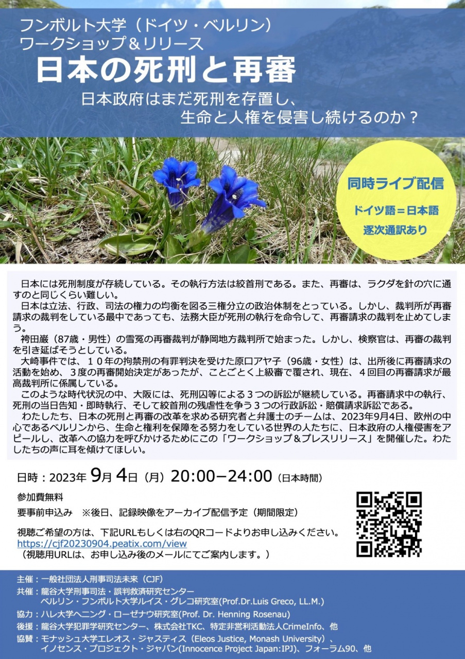 2023年9月4日(日本時間:20時、ドイツ時間:13時)から、ドイツのフンボルト大学において一般社団法人刑事司法未来(CJF)によるワークショップ&リリース「日本の死刑と再審―日本政府はまだ死刑を存置し、生命と人権を侵害し続けるのか?」が開催されました。
