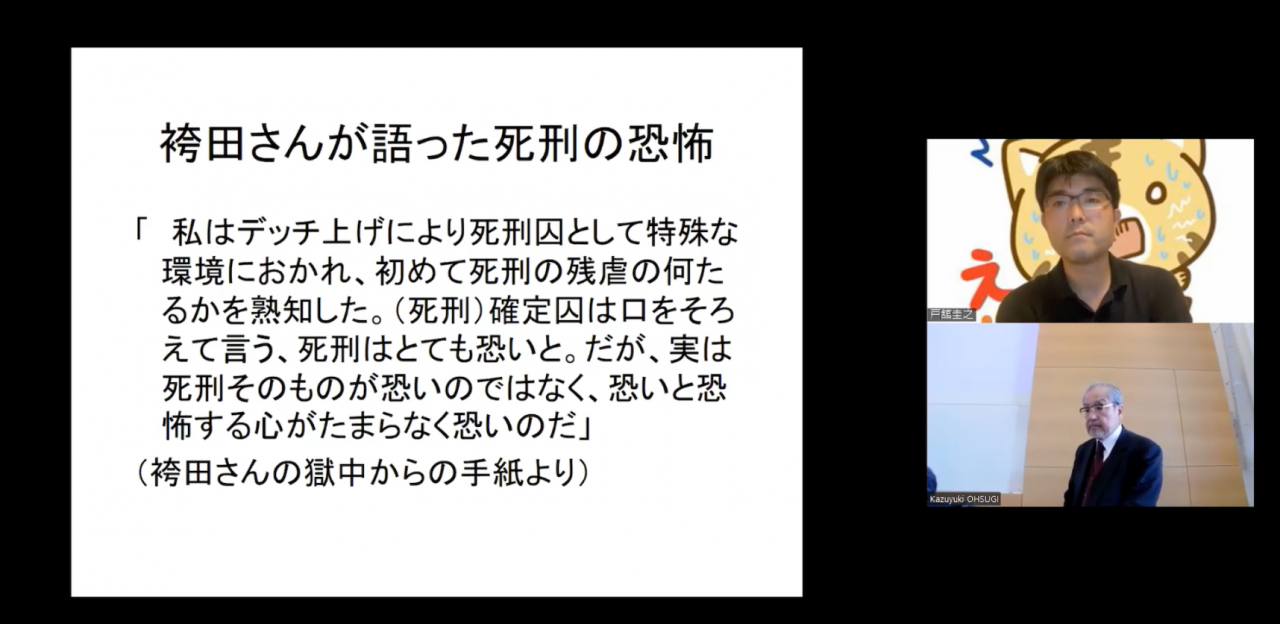 そこでは、第1に、袴田事件の再審裁判において、検察官が自らの過ちを認め、再審公判で争わないこと、そして可及的速やかに袴田巌氏を死刑囚という法的地位から解放すること、第2に、大崎事件の再審請求裁判において、最高裁判所は自らの過ちを認め、再審裁判を開 始すること、そして、可及的速やかに原口アヤ子さんを有罪者という法的地位から解放すること、第3に、日本政府が再審請求中の死刑執行をやめること、死刑執行期日を事前通告すること、絞首刑という人道に反する執行方法をやめること、そして死刑に関する全ての情報を当事者及び市民に公開すること、第4に、再審手続を明確化かつ適正化するために、再審に関する特別法を速やかに制定すること、第5に、死刑の執行に関する手続を明確化かつ適正化するために、死刑の執行に関する特別法を速やかに制定することが要求されました。