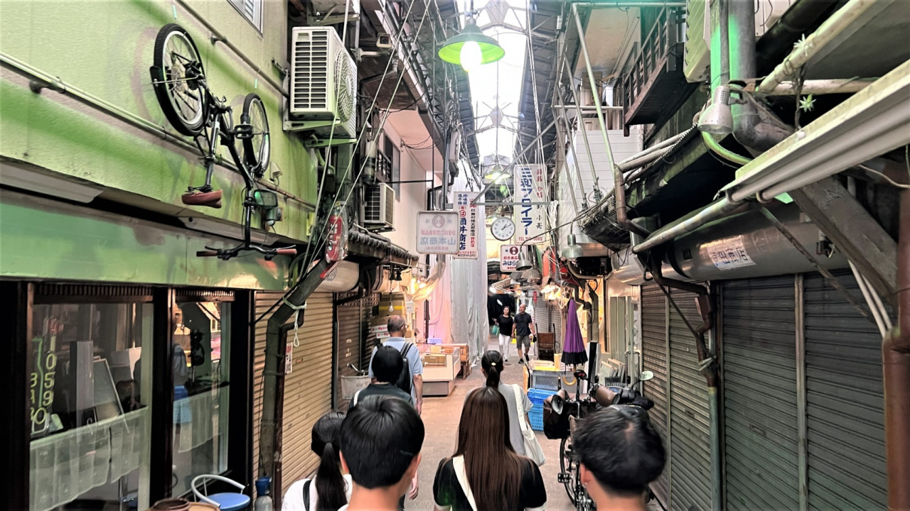 鶴橋駅に降り立った受講生らは、まず駅の界隈にある国際市場を見学しました。終戦直後に焼け野原となったこの土地一帯にできた闇市にルーツがあり、朝鮮や台湾の商品が入手できることから発展を遂げてきました。韓国の食品店やの日用品、韓国料理屋や焼肉屋のほか、鮮魚の卸売市場があったことから隣接する商店街には鮮魚や乾物などの専門店も軒を並べています。
