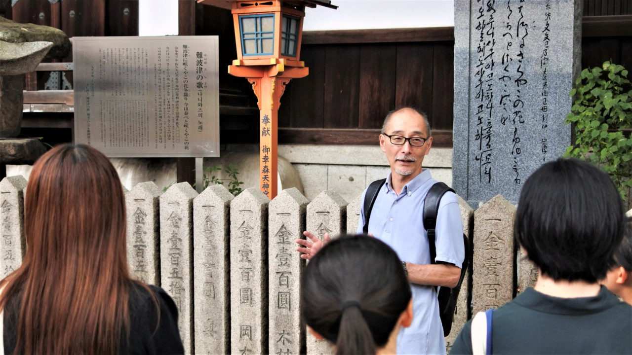 この大通りですが、元々は御幸森神社の参道でした。戦時中、この大通りに住んでいた日本人らの商店が建物疎開したり空襲で焼失したため、朝鮮市場の店主らが大通りへと進出してきたのがコリアタウンの原型となります。元々住んでいる日本人と在日朝鮮人の方々との緊張関係は当然ありましたが、当時の小泉首相の靖国神社参拝問題などを受けて日韓関係が悪くなった2000年代半ばに、こういう時だからこそ、国籍を越えて市民同士が手を取り合うべきではないかという動きが起こり、百済(古代の韓半島西部にあった国)から日本に渡って漢字や儒教などの学問を伝えた人物「王仁(わに)博士」の歌碑が御幸森神社に建立するプロジェクトが立ち上がり、そのことを機に市民同士の関係は新たなステージに移ったそうです。