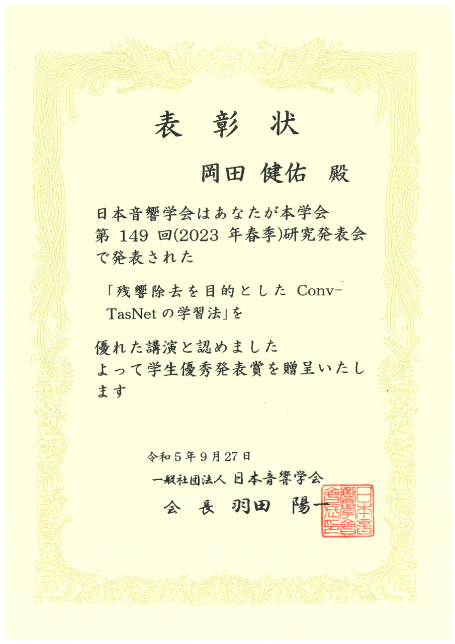 理工学研究科情報メディア学専攻を修了した 岡田 健佑 さん(片岡 章俊 研究室:現在NTTデータフィナンシャルテクノロジー勤務)が日本音響学会が主催する2023年春季研究発表会で学生優秀発表賞を受賞しました。