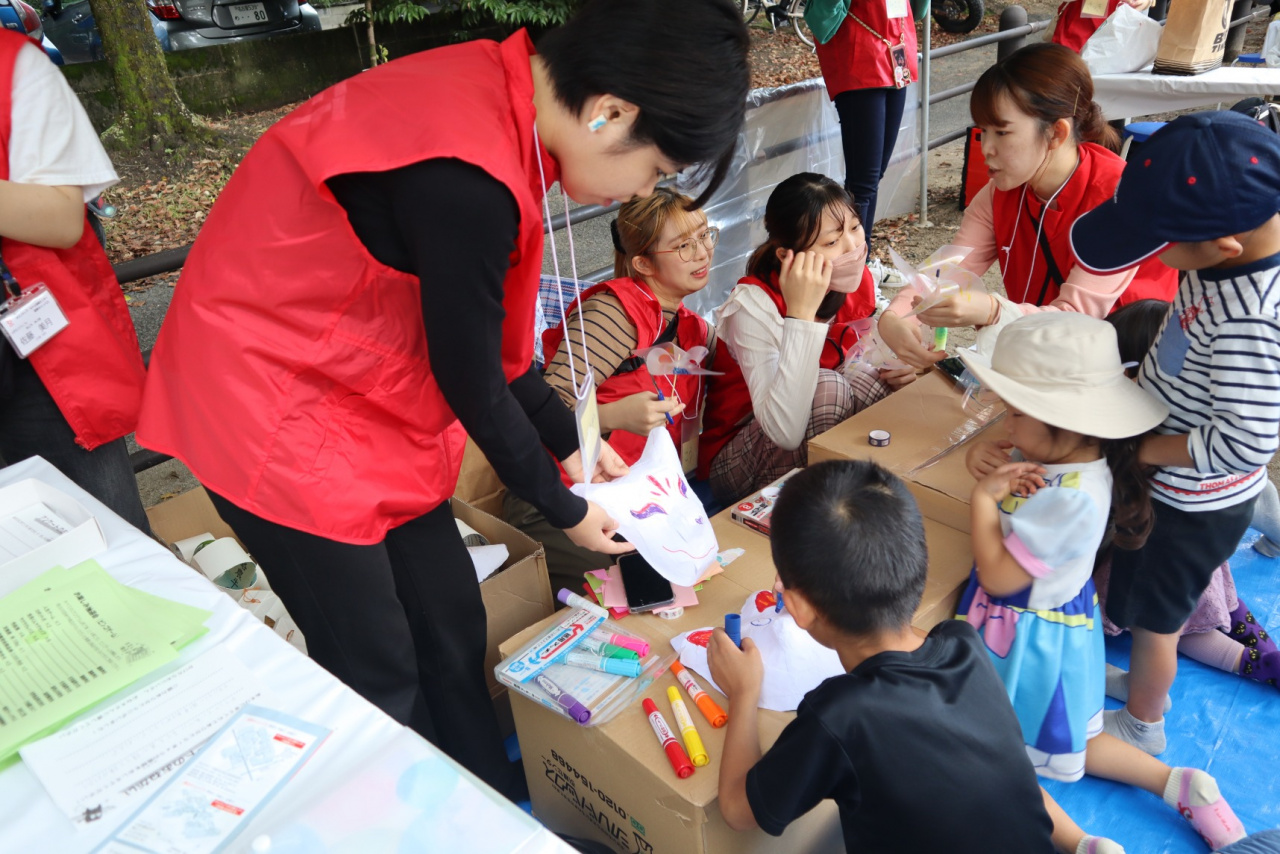 学生スタッフが内容考えた子ども遊びブース(輪投げ・お面作り・風車作り)の運営やお祭り全体の運営サポート(ゴミ分別ブースや飲食ブース等の行列整理、舞台設営等)を担いました。