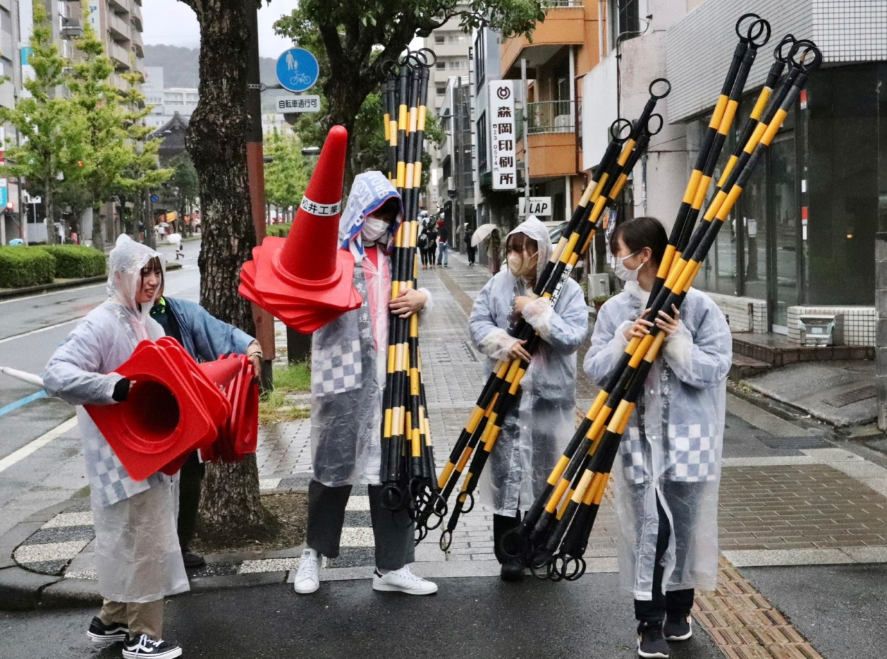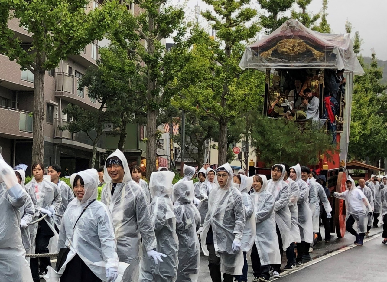 午後からは雨になり、全員カッパを着用して活動。雨天でも巡行経路一帯ではお囃子が響いて祭を盛り上げていましたが、重要文化財の保護の観点から、大津祭曳山連盟の判断により早めに巡行を終了することになりました。