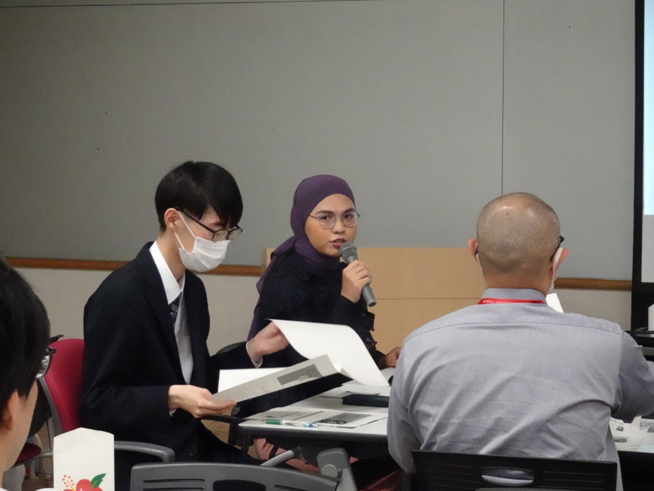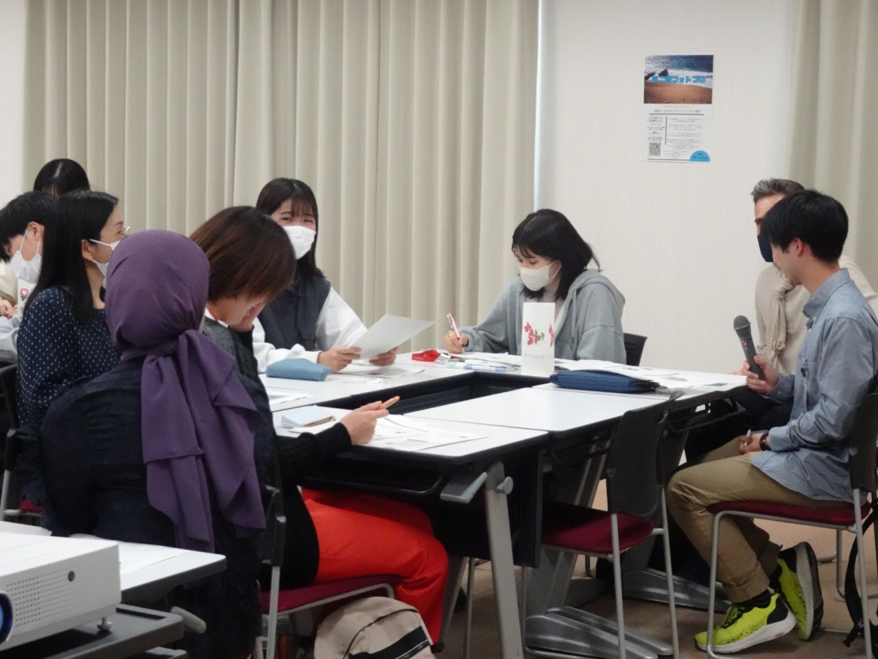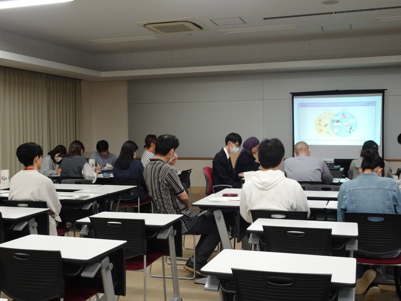 まず、プロジェクトリーダーの学生より開催趣旨について説明があり、メンバーの一員でもある留学生に「ハラールフード」についてご講演頂きました。講演後はグループに分かれて意見交換を行いました。33名の参加があり大変好評でした。