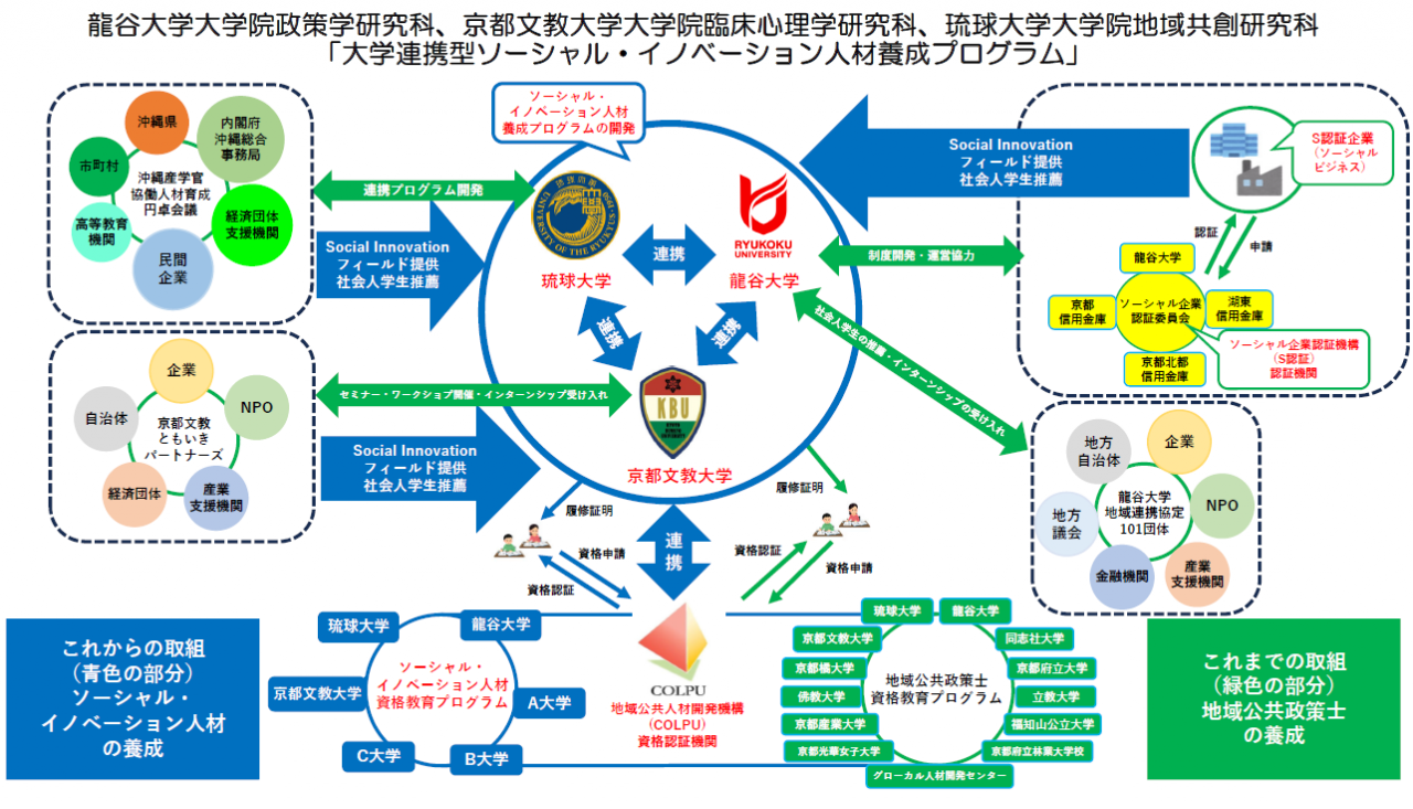 3大学の各研究科は、「大学連携型ソーシャル・イノベーション人材養成プログラム」(以下、本取組)を2025年度から開始する予定です。「地域公共政策士」という既存の資格を認証している一般財団法人地域公共人材開発機構(COLPU:コルプ)とも連携し、「ソーシャル・イノベーション人材」資格認証制度を開発・運用します。