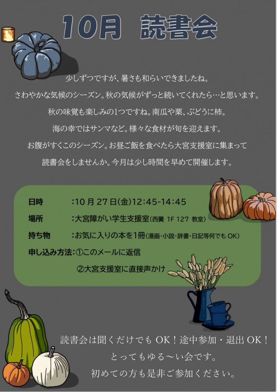 2023.10.31 読書会へ参加しませんか?【共生のキャンパスづくり・事務局:障がい学生支援室(大宮)】 #学生生活 #課外活動 大宮学舎の障がい学生支援室には、本好きの学生達が「お勧め本」を片手に集まります。 月1~2回、学生の都合に合わせて不定期で「読書会」を開催しています。 本の紹介からあちこちに脱線し、楽しく会話がはずみます。 誰でも参加OK!途中入退室OK!のゆる~い読書会です。 詳しくは、大宮学舎西黌の障がい学生支援室まで。 読書会の様子 本のジャンルは様々 開催日は、大宮学舎西黌1階の障がい学生支援室へお問い合わせください