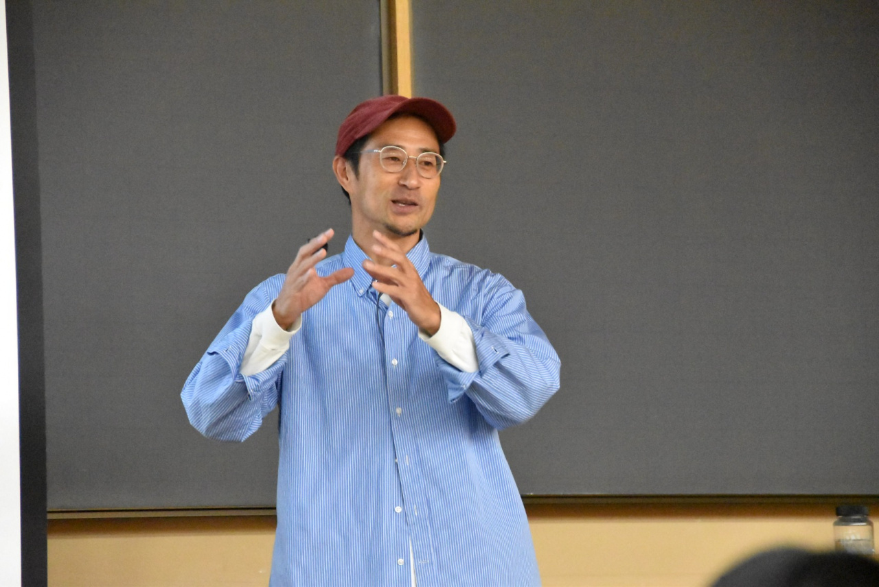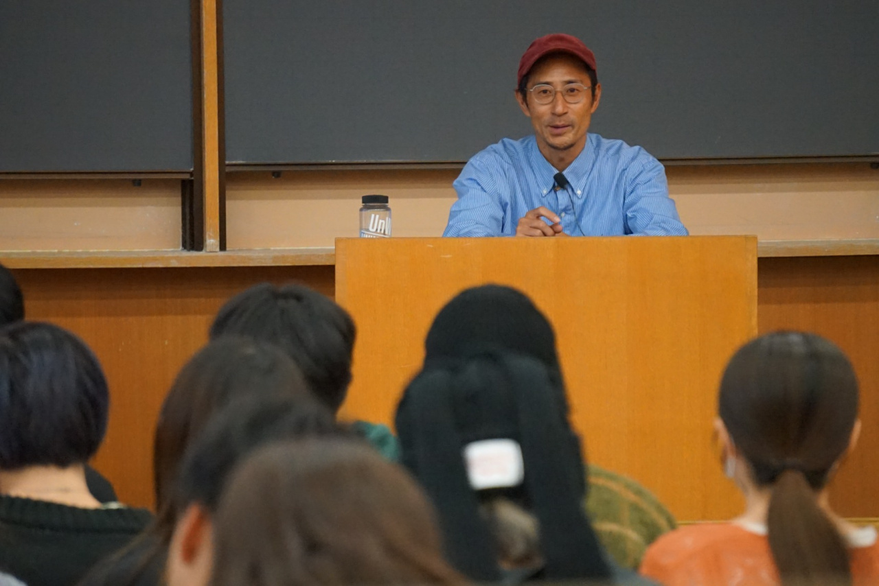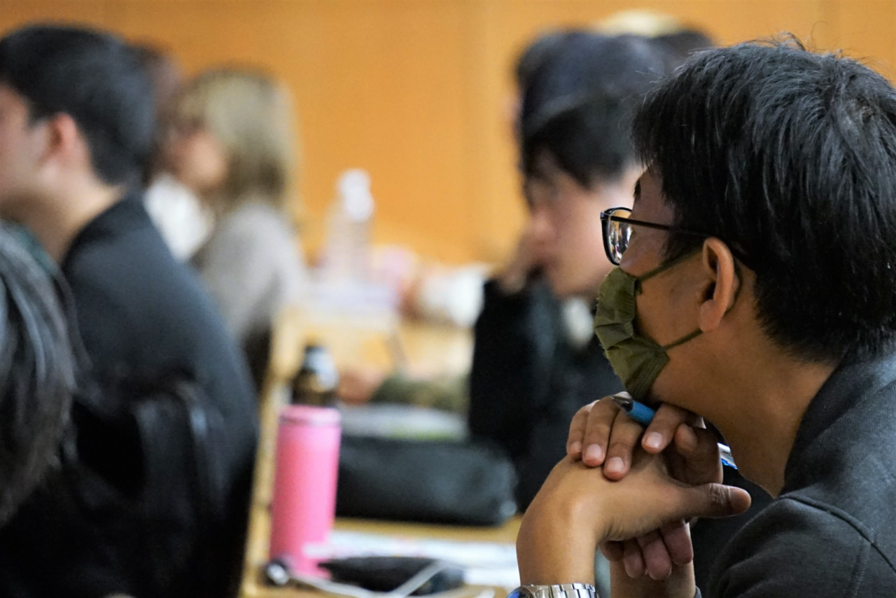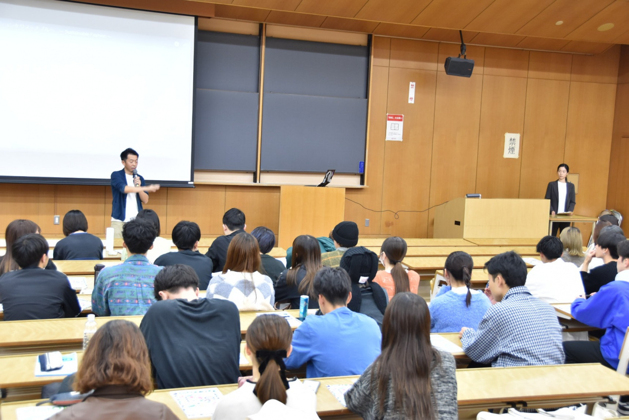 「アイデアソン」とは「アイデア」と「マラソン」を掛け合わせた造語です。今後、ファッションロスをテーマに経営学部眞鍋ゼミナール(以下、眞鍋ゼミ)が新たなビジネスアイデアを発案していきます。株式会社ヒューマンフォーラムから代表取締役社長 岩崎仁志氏を講師に迎え、ファッションロスの現状や課題、「RELEASE⇔CATCH(※2)」の取組について、今後のビジネスアイデアのヒントとなる情報提供をいただきました。参加者からはファッションロスの現状について、取り組みについての質問がなされるなど、熱心に聞き入っている様子でした。
