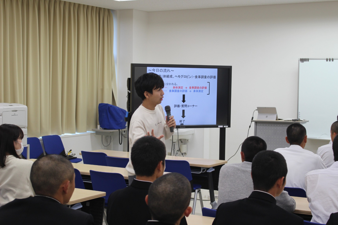 今回は初回講義となるため、選手のIn Body(体組成)の測定、ヘモグロビンの測定、食事アンケートを基にした栄養バランスの偏りなどを数値で確認しました。その後、データの見方や食事の大切さについて、学生が講義を行いました。In Bodyを計測した選手たちは、「思った以上に筋肉量が少なくてもっと練習しないといけないと思った」「自分の強い箇所と弱い箇所を数値でわかることによって、取り組むべきことがはっきりしました」といった感想を話してくれました。
