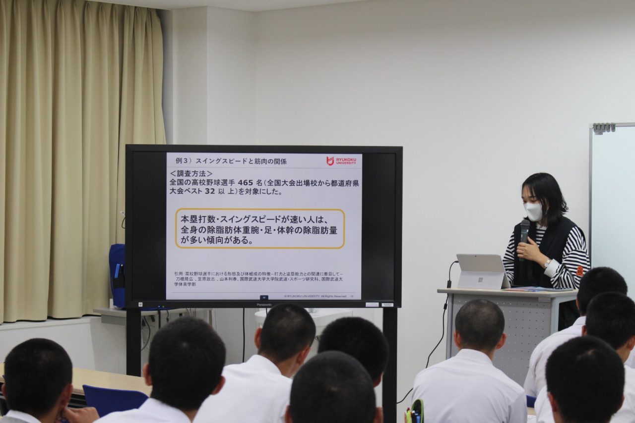 膳所高校野球部は2018年の第90回記念選抜高校野球大会に出場。全国でも稀なデータ分析の専門部員を擁して戦うなど、データに重きを置く最先端の野球に取り組んでいます。データを用いて野球に取り組むことに対して慣れており、数値などで課題などが明確になったほうが取り組みやすいとのこと。清水先生は、「コロナ禍のため、学外で学ぶことをほとんど規制されてきた世代なので、今回の機会はいろんな面で本当に価値ある体験を選手たちはさせてもらっていると思います。大学の学びを得られる機会も少ないので、いろんなものを吸収してほしい」と話されていました。