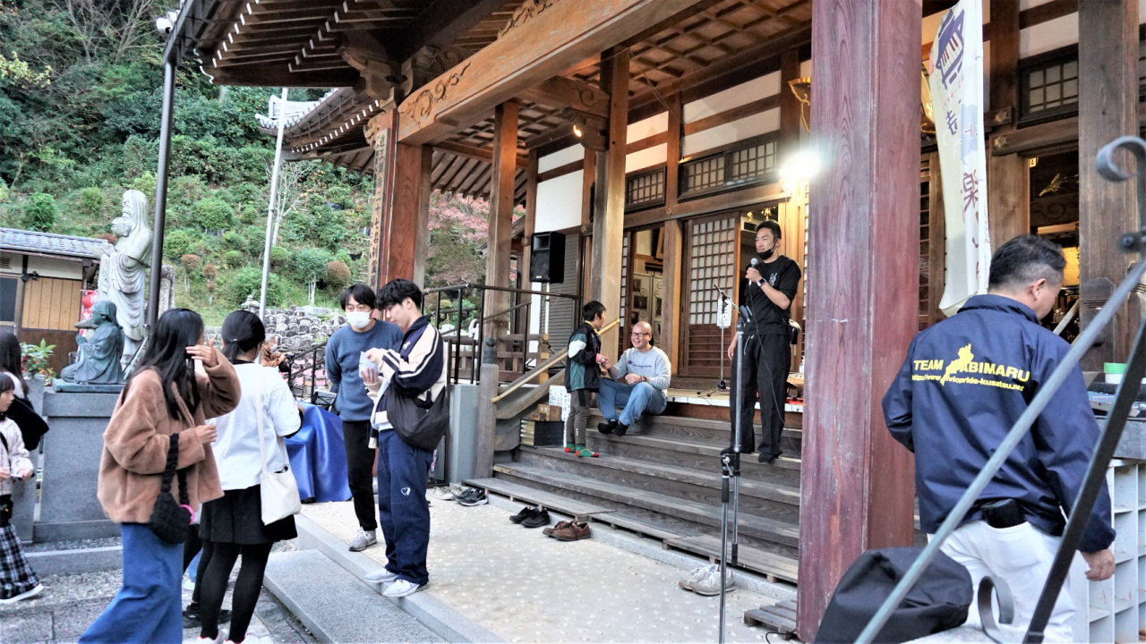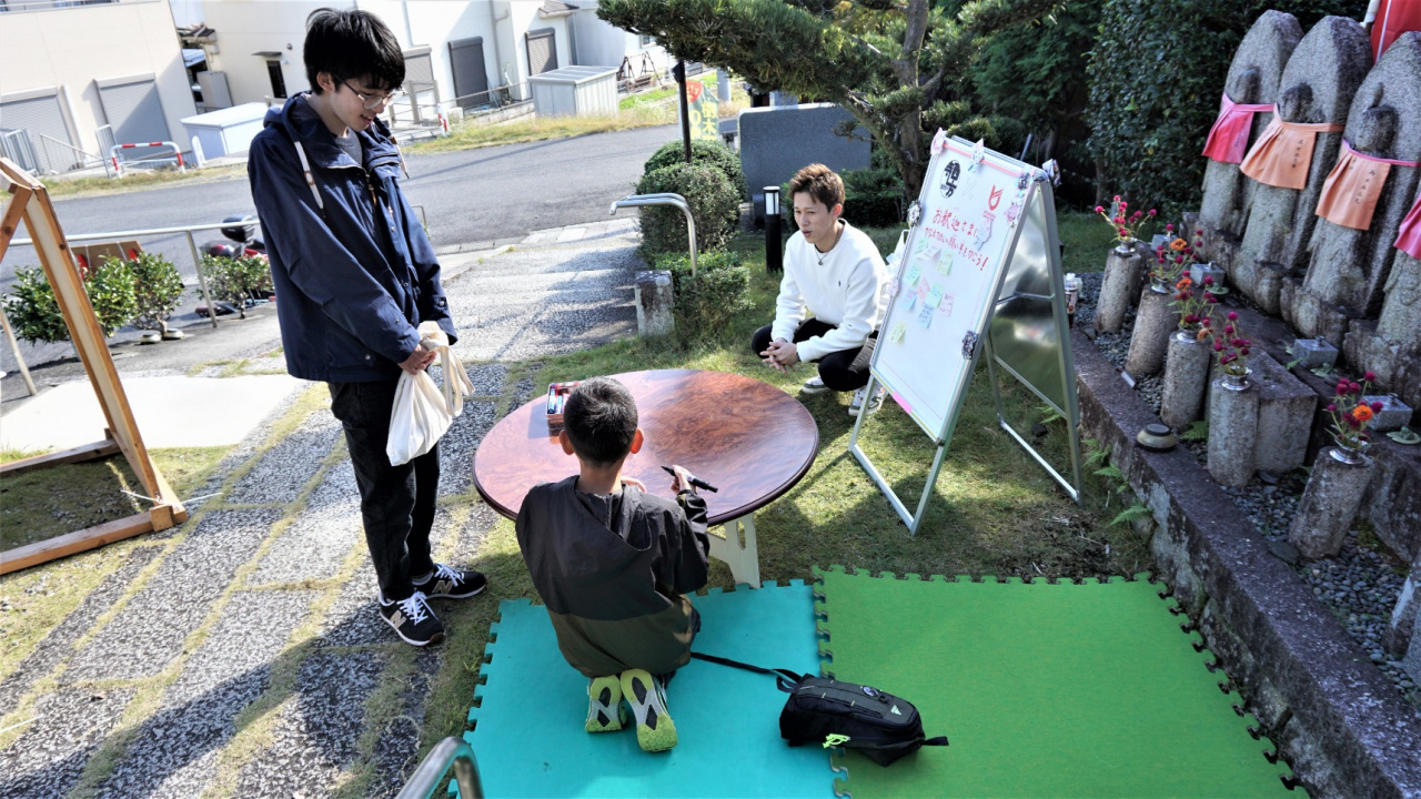 しかし、当日の流れで、山門前の本堂前の駄菓子屋さんが型抜き用に設置していたテーブルの近くにメッセージボードを設置していただくことになり、型抜きをやりに来ているお子さんたちや山門前の階段を登ってきたお客さんたちに「ようこそ」のあいさつをしながら、メッセージの呼びかけをする形となりました。