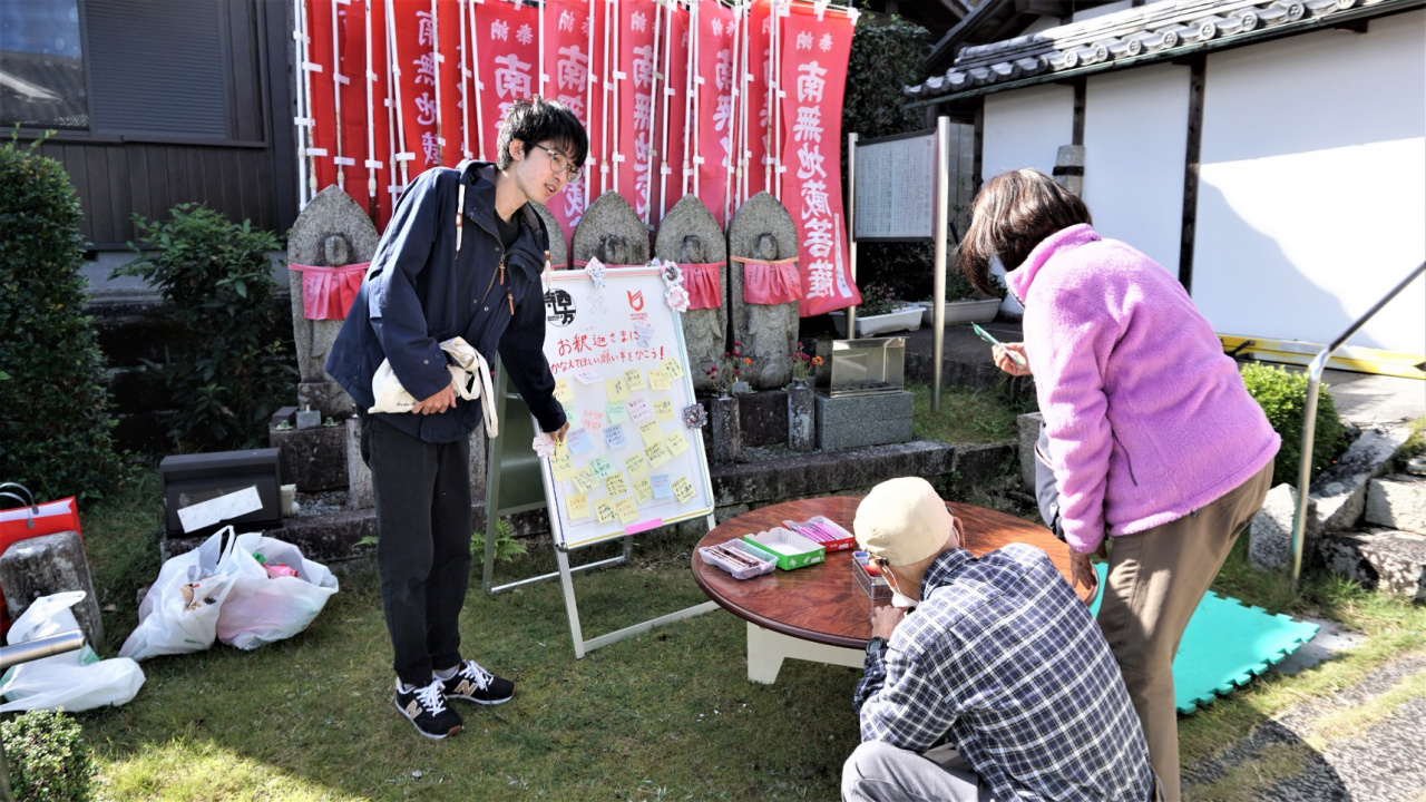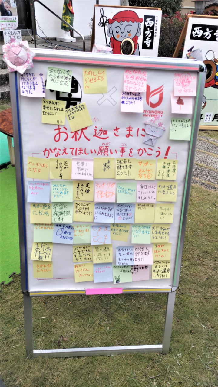 龍谷大学と西方寺とのコラボレーション企画は、西方寺の方よりご提案いただいた「メッセージボード」の設置です。来場してくださった皆さんに、受講生たちが考えたテーマのもと、付箋にメッセージを書いて貼っていただきました。受講生たちのアイディアで、1111年祭とポッキーの日にちなみ、メッセージを書いてくださった方々にポッキーやプリッツを配りました。