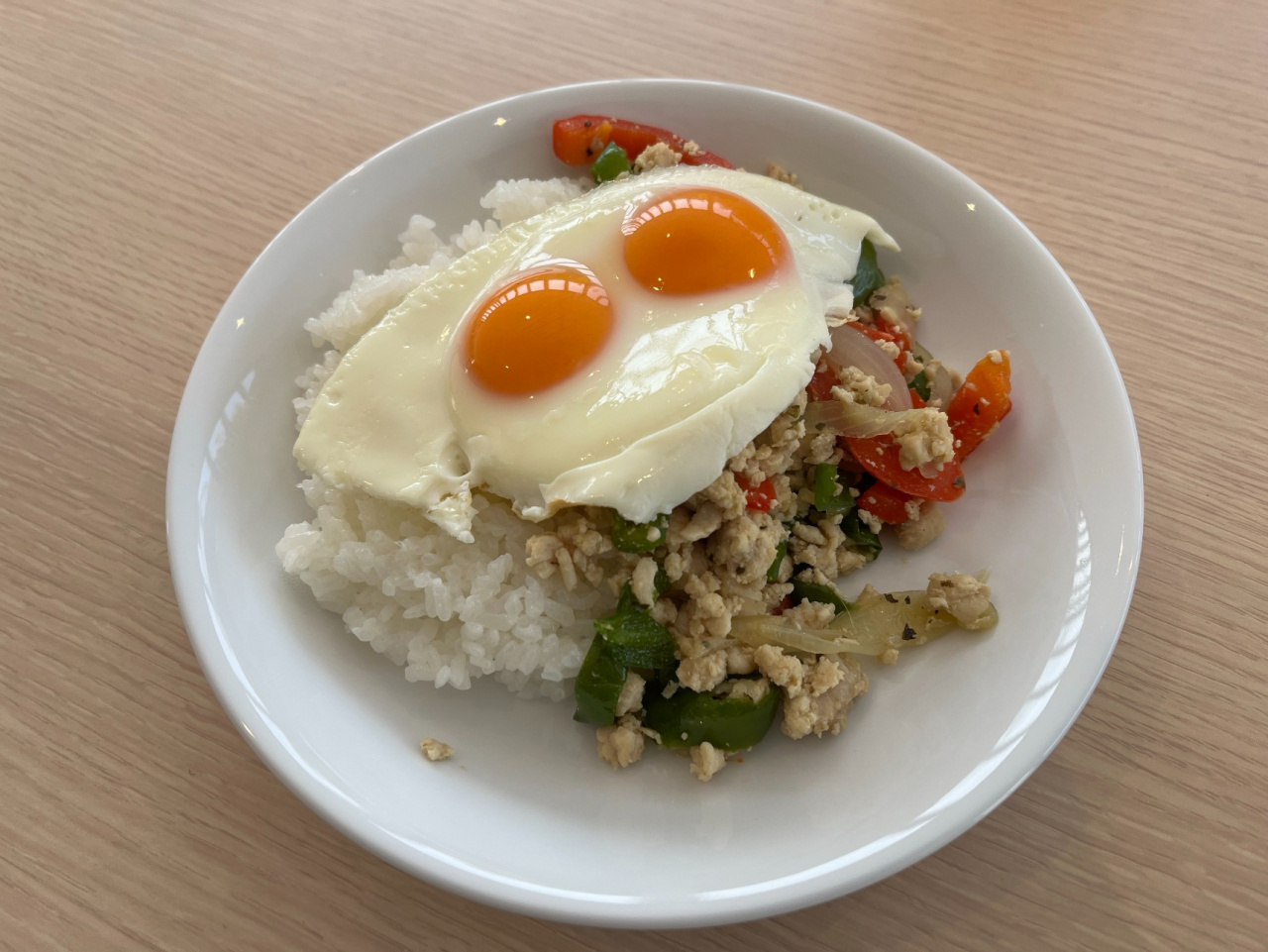 一緒に調理に参加した農学部生はタイの学生からパパイヤの伝統的な切り方(sub)や、グリーンパパイヤサラダのソースの作り方を教わりました。また、牧農場で収穫したおおまさりやパクチーはガパオライスのトッピングとして活用しました。