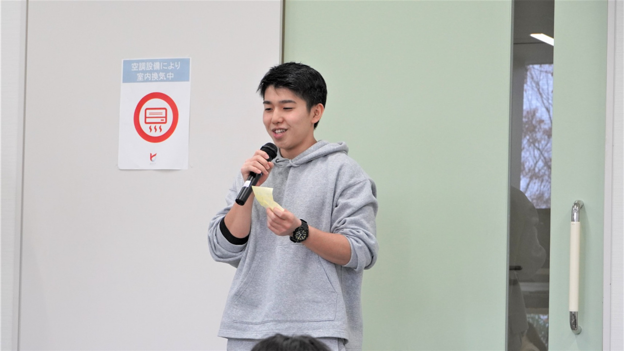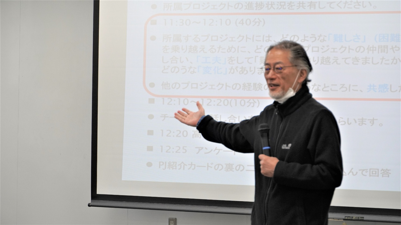 初めに、古莊匡義准教授(コミュニティマネジメント学科)から、「前期に比べて各プロジェクトの活動が進み、ある程度やるべきことが決まってきているでしょう。活動が進んでくると全然違うテーマなのに、実は同じようなことを考えている、同じような課題に直面しているということが見えてきていると思います。前期に共有したことよりもさらに深く悩みを共有できたり、違うプロジェクトでも何かヒントを得られるきっかけになったりすると思うので、本日は有意義な時間を過ごしてほしいです。」と開会のあいさつがありました。