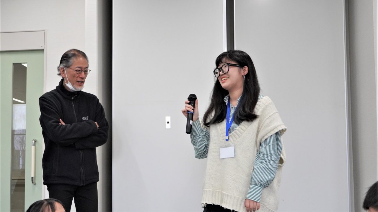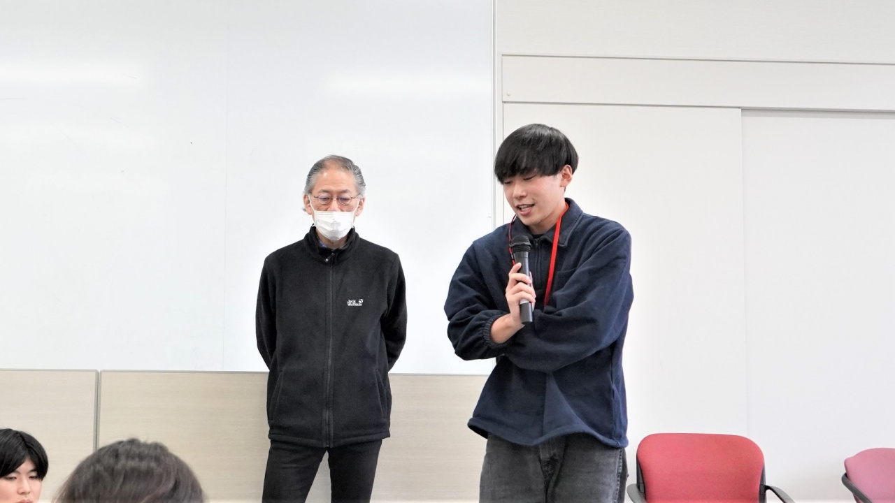 司会の脇田健一教授(社会学科)からは、次のようなことが伝えられました。「自分と環境や価値観の違う学外の方とコミュニケーションをとり、何かを作り上げていくことは貴重な経験になったと思います。その中で、色々な困難に耐えてつらい思いをする中で自分を深めていくと、自分自身のするべきことや希望が見えてきたのではないでしょうか。」