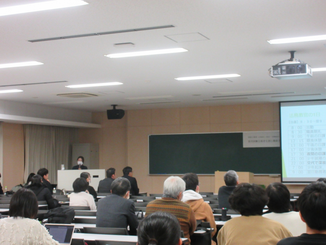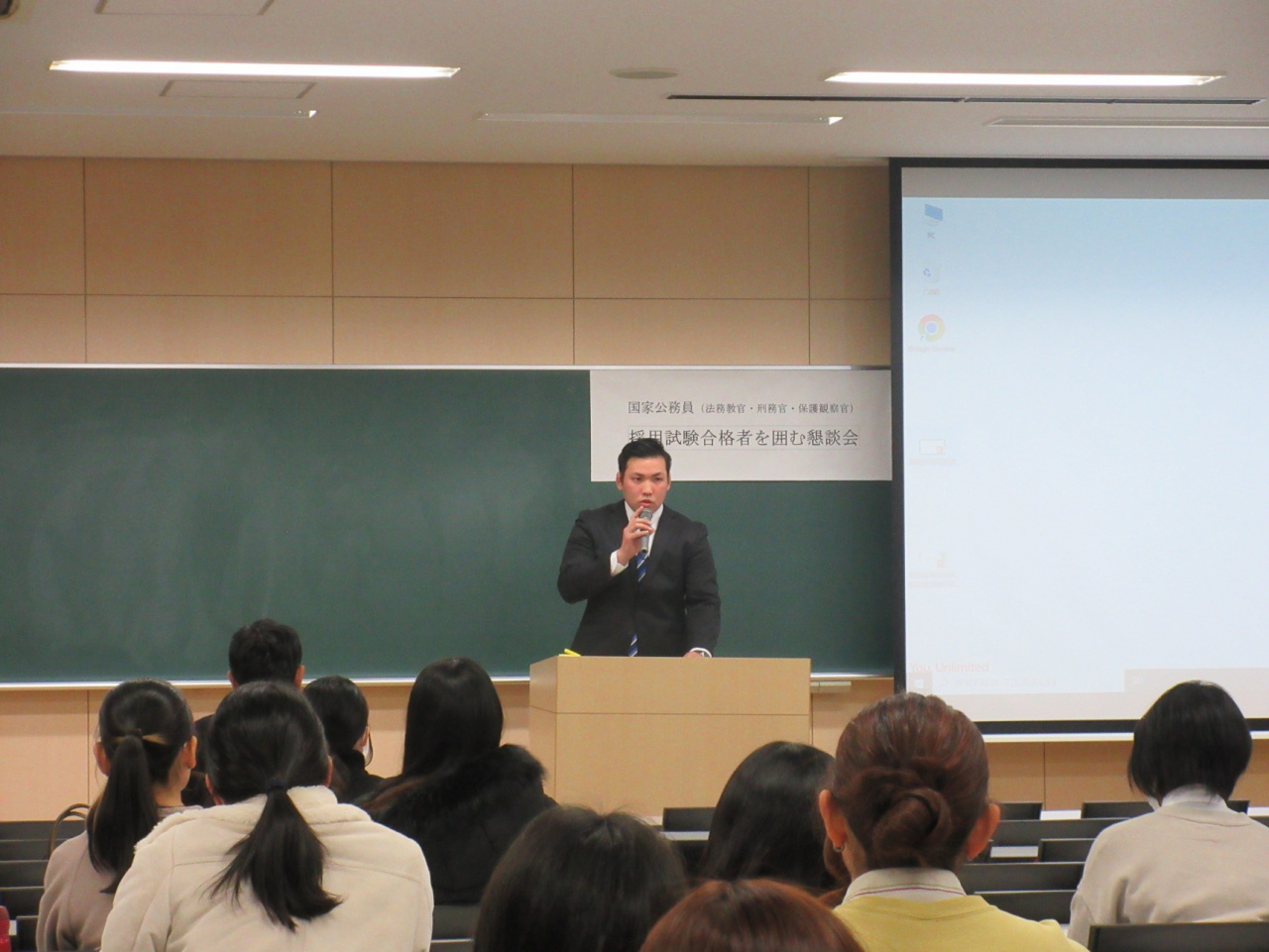 龍谷大学矯正・保護課程では、毎年度、学生のキャリア支援の一環として、本学の在学生や卒業生で、国家公務員(法務教官、刑務官、保護観察官)採用試験に合格した方や本学出身の現職の方を講師にお招きし、本課程を受講している学生らに対して、自身の合格体験談や現在の仕事内容などをお話しいただく機会として「国家公務員採用試験合格者を囲む懇談会」を開催しています。今年度もこの懇談会を12月1日(金)に開催しました。当日は将来法務教官や刑務官、保護観察官などをめざす学生約50名が参加し、講師の話(アドバイス)に熱心に耳を傾けていました。