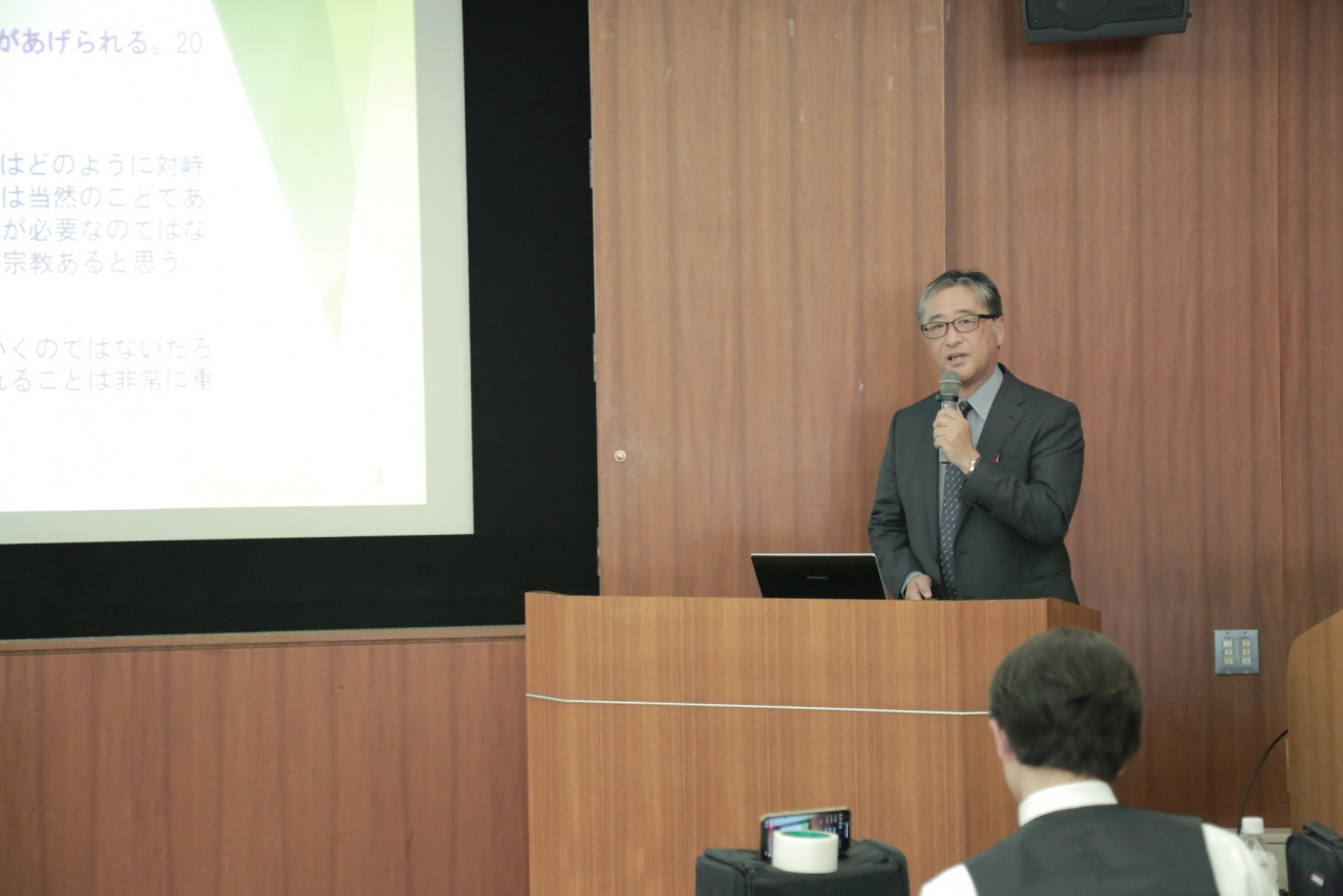 釈尊をはじめとする、親鸞聖人や蓮如上人が長寿であるという事実から、仏教的考えが持ち合わせる精神的な安定は長寿に関係しているのではないかと目を付け、また、近年発表されている精神歴なものが自律神経に作用し疾病に影響を与えている事実も挙げ、法話による影響の裏付けをいくつか挙げていらっしゃいました。