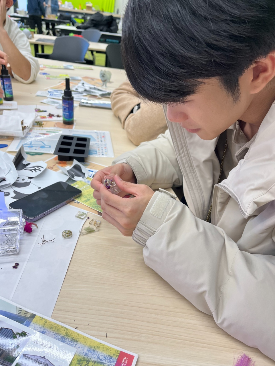 STEAMコモンズのスタッフ(山口さん)に様々な機器の使い方を教えて頂きながら、3Dプリンターを使った小物やレジン液を使ったストラップ、このプログラム中に撮影した写真を使ってアクリルスタンドやステッカーを作りました。