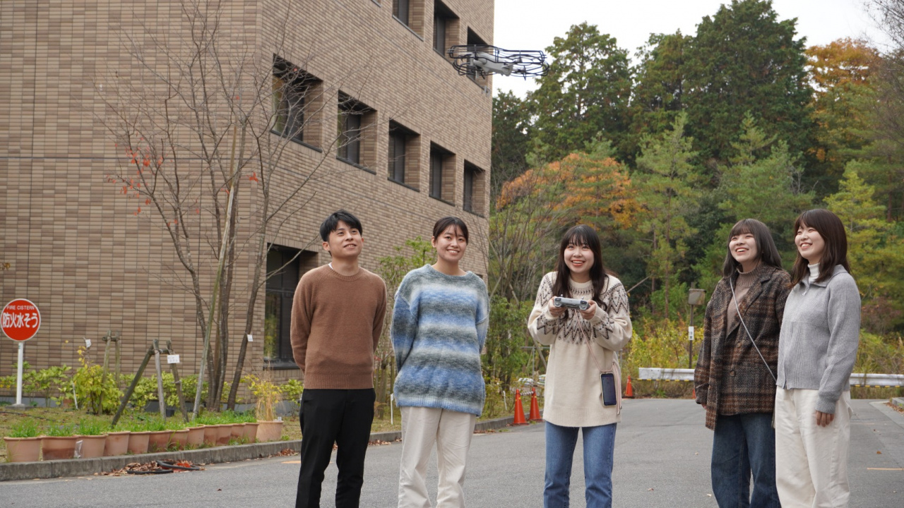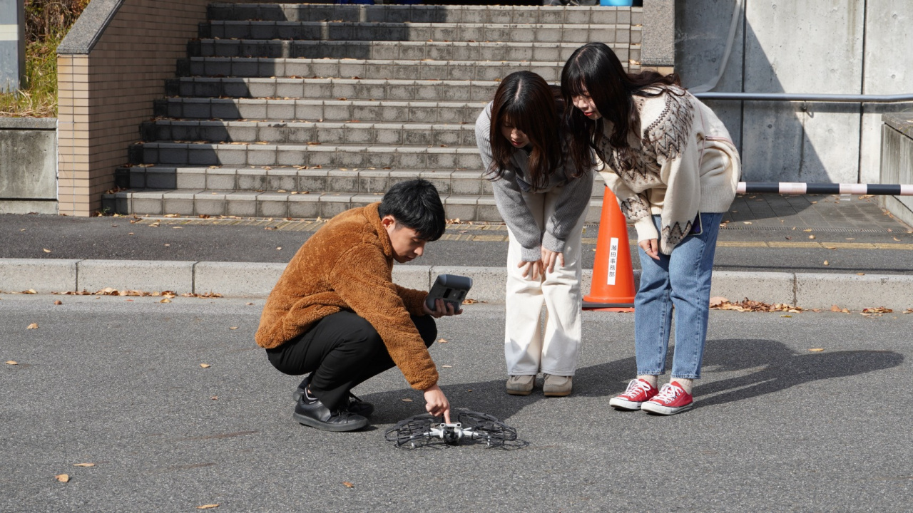 この日は、本プロジェクトの担当教員指導のもと、2年目受講生である岩井田雄大さん(現代福祉学科3年生)が1年目受講生たちに操作方法を説明し、全員が飛行練習をおこないました。少し風が吹いており、コンディションとしてはあまりよくありませんでしたが、目の前で舞い上がるドローンに歓声をあげたり、思わず自身のスマートフォンで撮影しだしたりと、楽しんで操作方法を学びました。