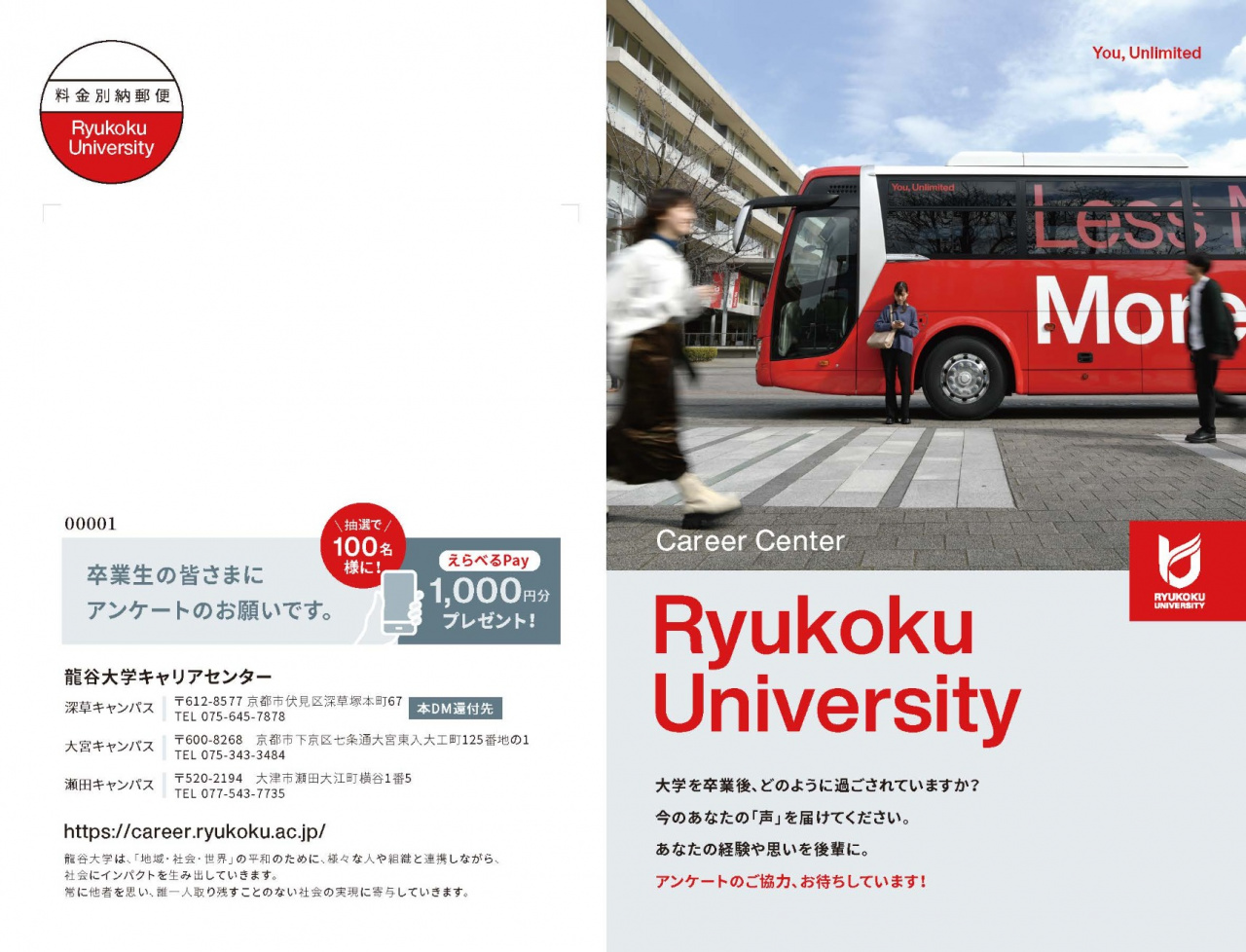 龍谷大学キャリアセンターでは、本学の教育プログラムおよびキャリア支援を検証し改善するために卒業後1年目および4年目の卒業生を対象として、毎年「卒業生アンケート」を実施しております。