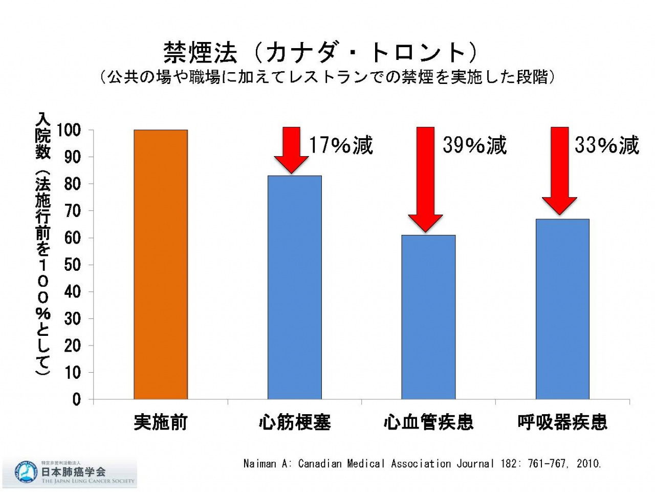 少し古いデータですが、カナダ・トロントにおいて公共の場や職場に加え、レストランも禁煙にしたところ、心筋梗塞、心血管疾患、呼吸器疾患による入院数が各々17%、39%、33%減少したとの報告がなされています。
