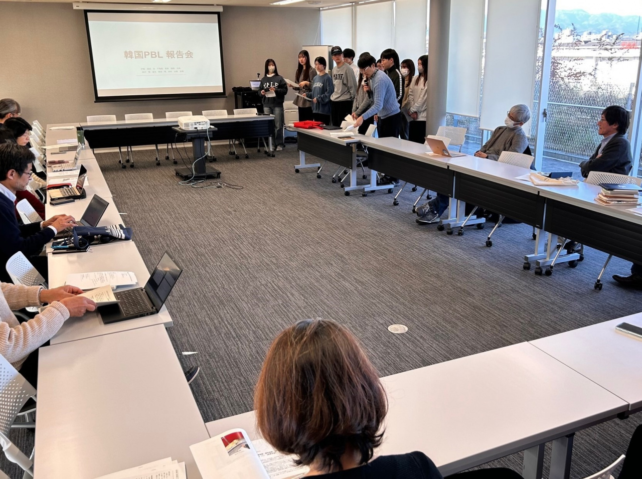 2023年12月12日(水)14:30~15:00に韓国PBLの受講生15名が、政策学部教員に対して海外プログラムでの学習成果について報告を行いました。