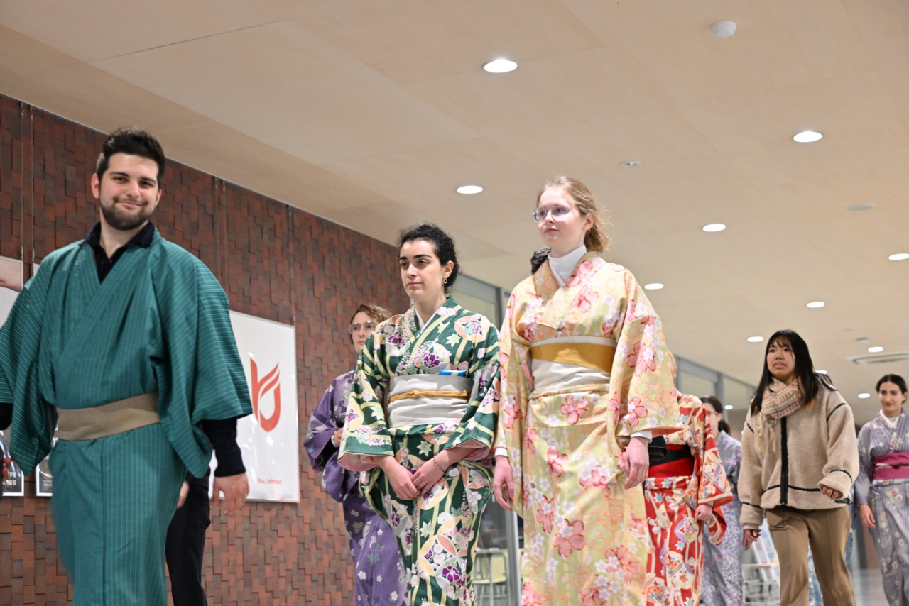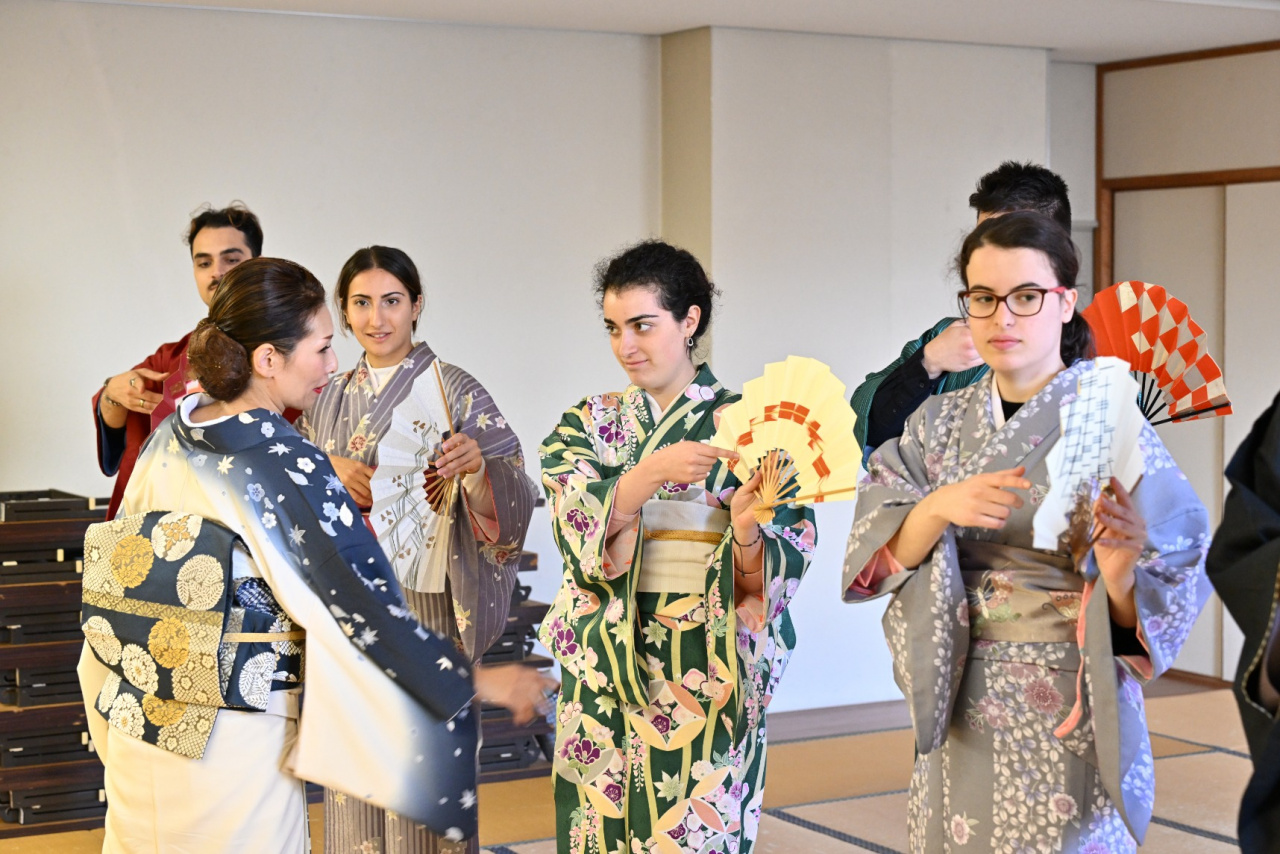 授業の後は少し休憩があり、その後は和装で日本舞踊を行いました。色々な色や柄が選べましたが、どれも美しくて選ぶのが大変でした。和装を着た後は、舞踊の練習が始まりました。一人の女性が日本舞踊を披露してくれ、その優雅さと美しさに感動しました。私たちもいくつかの動きを試してみましたが、とても良い経験でした。
