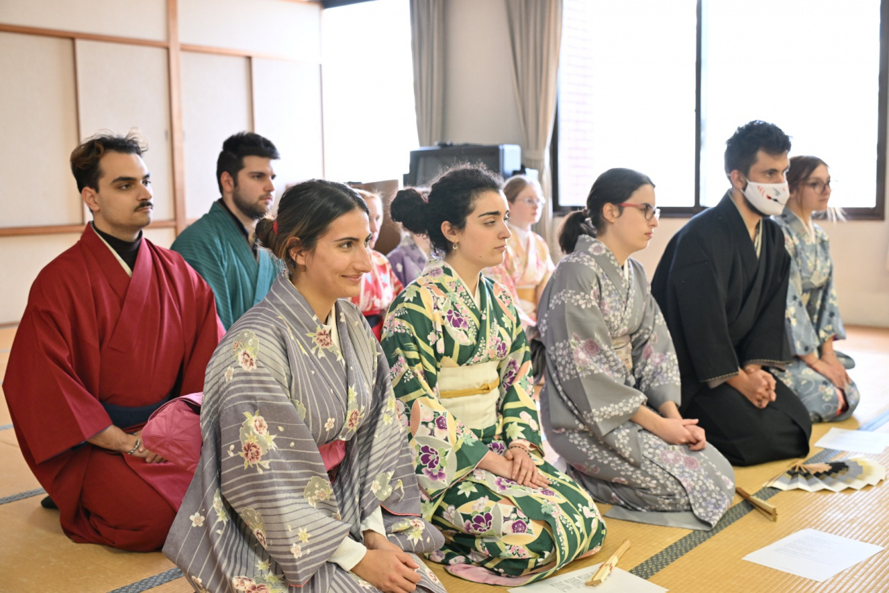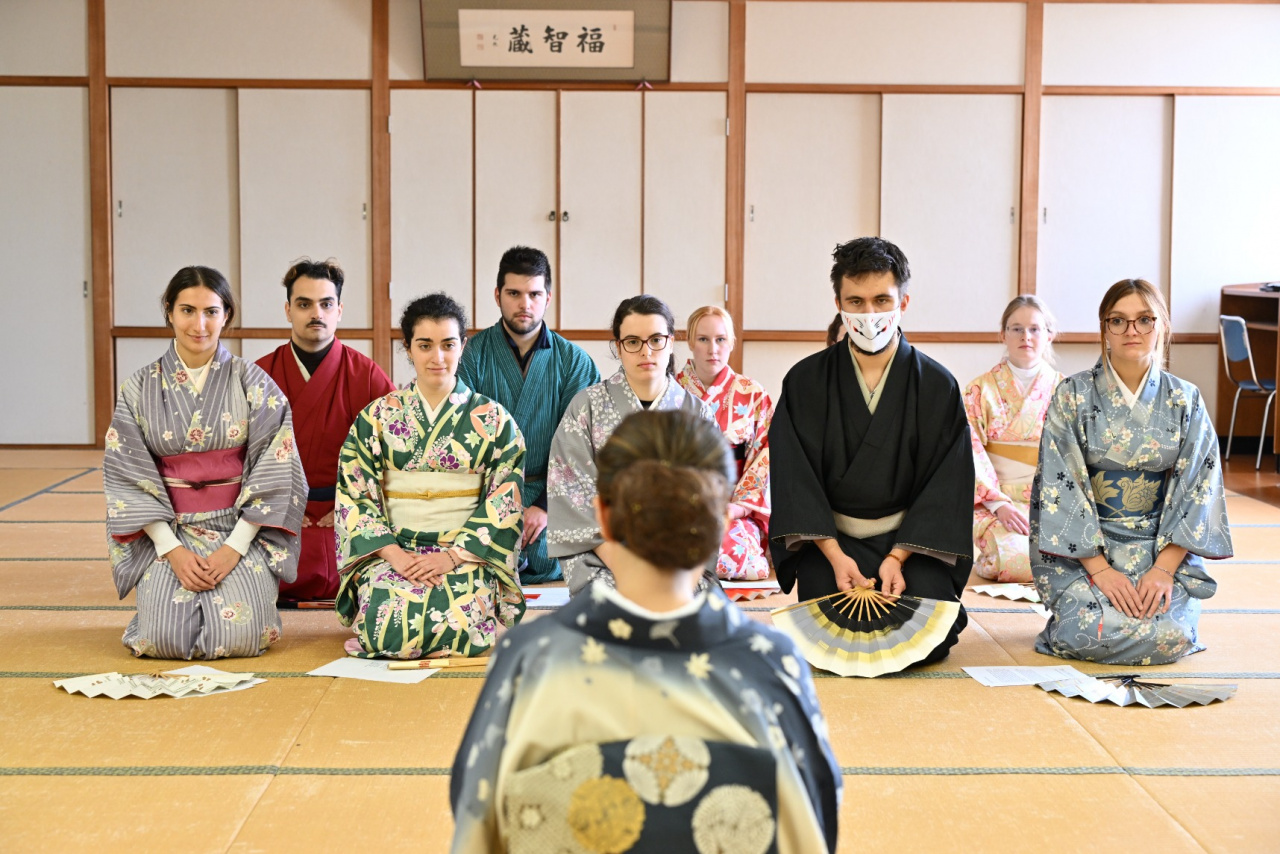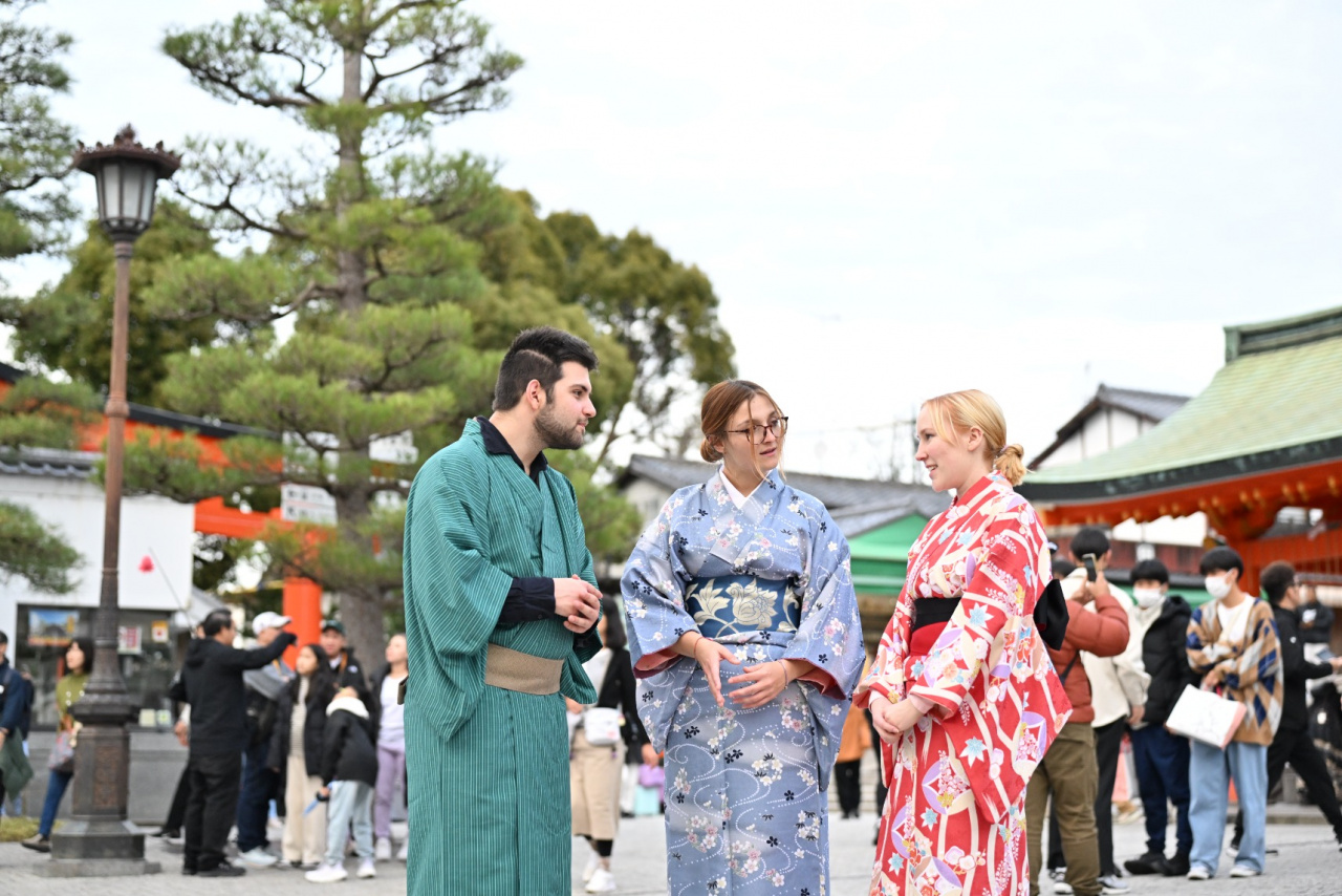 2023年12月5日(火)から15日(金)まで、海外協定校の学生を対象に、短期留学プログラム「R-STEP(Ryukoku Short-Term Experience Program)」を開催しています。今回は3ヶ国から10名の学生が参加。12月14日(木)プログラム9日目は、午前中に「Japanese Launguage」の講義内で、日本語でR‐STEPについてプレゼンを行いました。その後、Ryukoku Student Buddies(龍谷大学生バディ)とともにフィールドトリップで日本舞踊体験を行った後、伏見稲荷大社へ行きました。