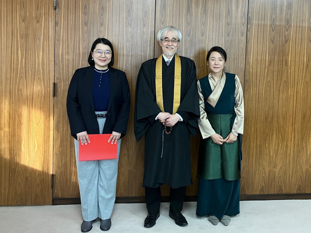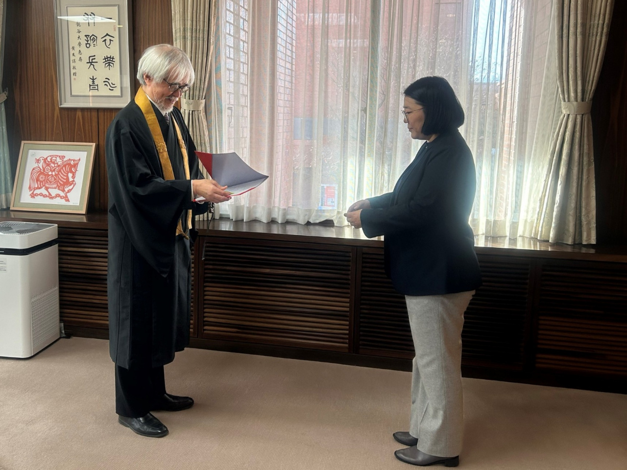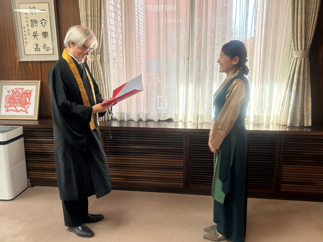 この度の授与式では、李 桃(リ タオ)先生、Lu Mu Cao(ル モ ツォ)先生の2名が受賞されました。受給研究者からは、研究の内容が紹介されました。入澤学長からは、沼田恵範氏の思いを継ぎ、仏教の学術振興や海外伝道に貢献することとともに、仏教研究における中国やチベットとの更なる学術交流への期待が祝辞として述べられました。