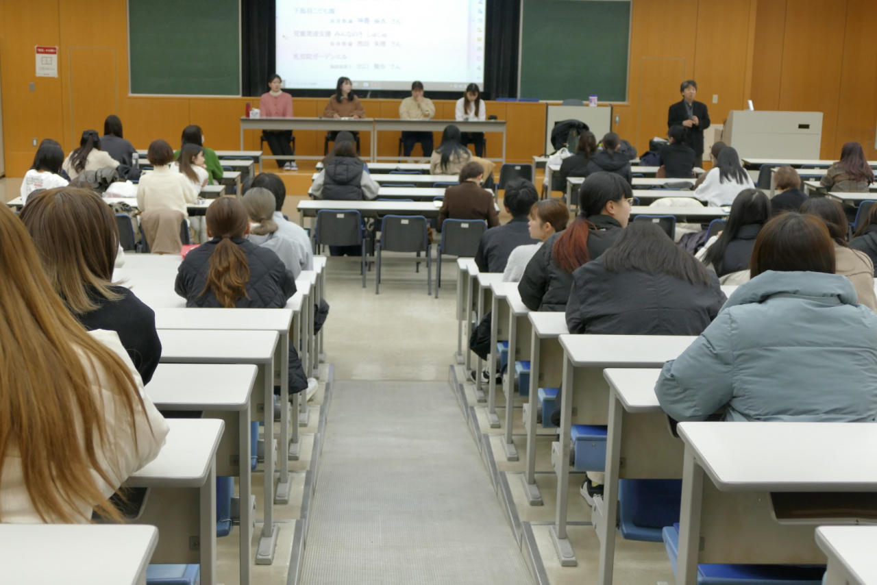 同日2講時には、4名の卒業生が2年生に保育現場での職務と課題について現場報告をしてくれました。児童福祉施設、保育・幼児教育の現場での仕事のやりがい、また厳しい話題についても率直に語り、現場に身を置いて学び続ける姿を示してくれました。4月から就職・編入する2年生は、先輩の声にじっと耳を傾け、自らの未来を先輩の働く姿に重ね合わせて期待を抱いていました。