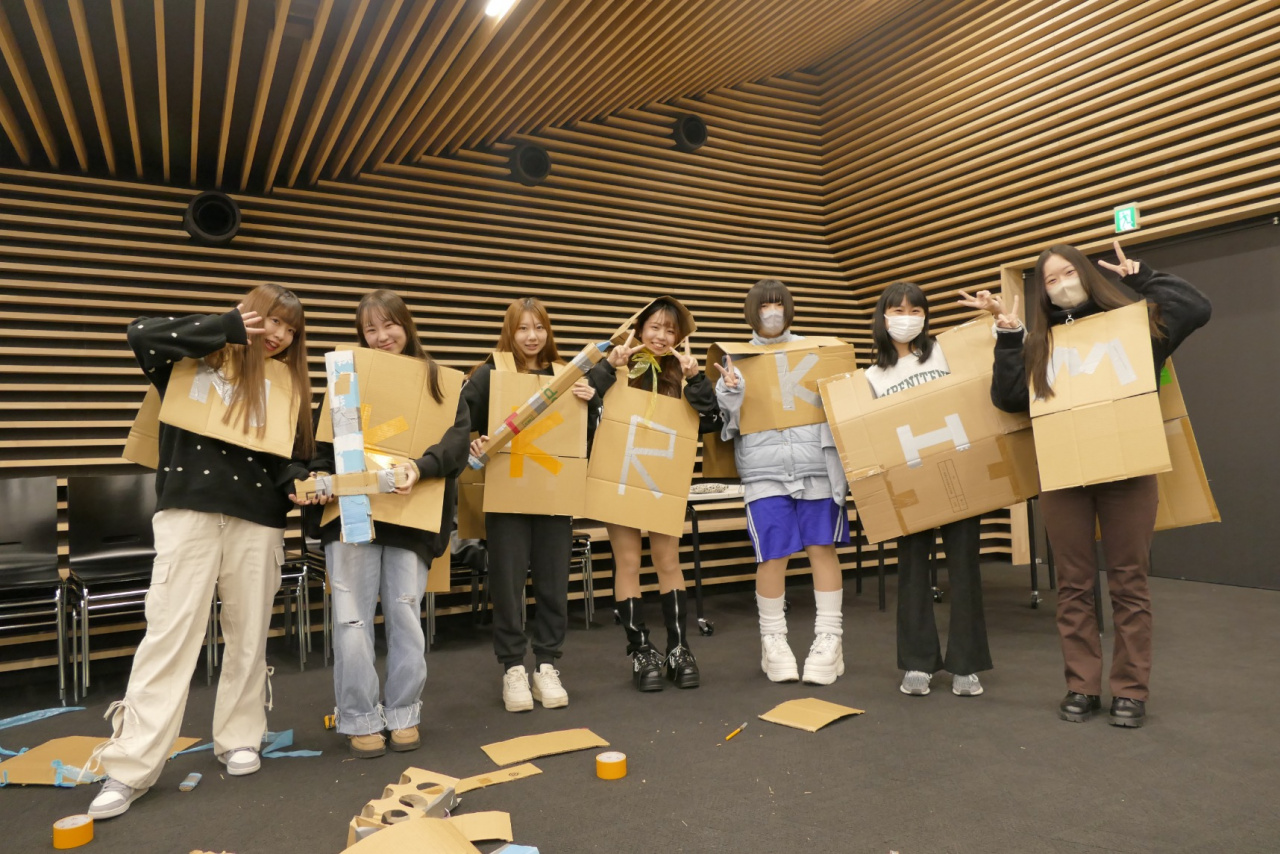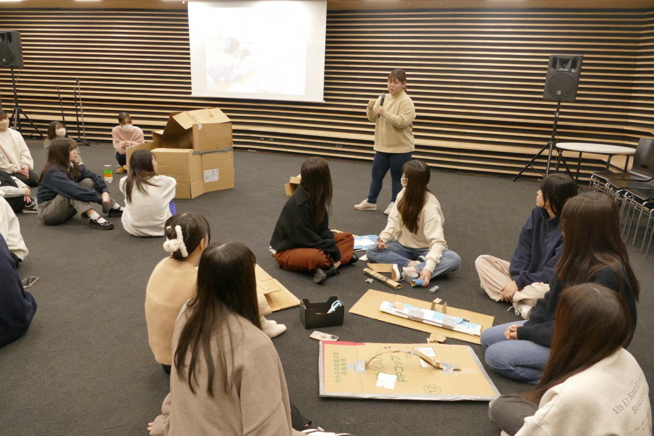 幼稚園・保育所での実習に初めて臨む1年生にとって、先輩から保育現場の実情をうかがい、子どもの発達や保育の実態に即した保育実技のありかたを学ぶよい機会となりました。廃材を活用して仲間と共に製作を楽しむ保育活動、グループで協力し身体を動かす保育活動、音楽を楽しむ保育活動など、3名の先輩がそれぞれの個性や持ち味をいかして指導してくれ、1年生も活動を思い切り楽しんだ後、先輩方の話に熱心に聞き入っていました。