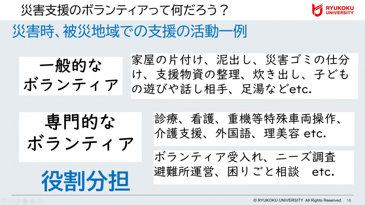 そこで、「被災地のために何かしたい」と考えている本学学生・教職員の皆さんに向け、災害ボランティア講座を開催しました。