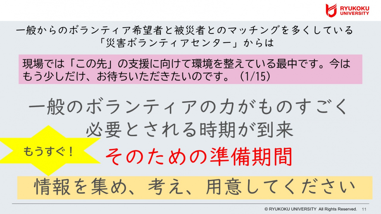 ボランティア・NPO活動センターでは、今後本学でどのような支援ができるのかを学生と共に考えたり、学内で連携を図りながら、この度の能登半島地震で被災された方の復興に繋がる取り組みを検討してまいります。
