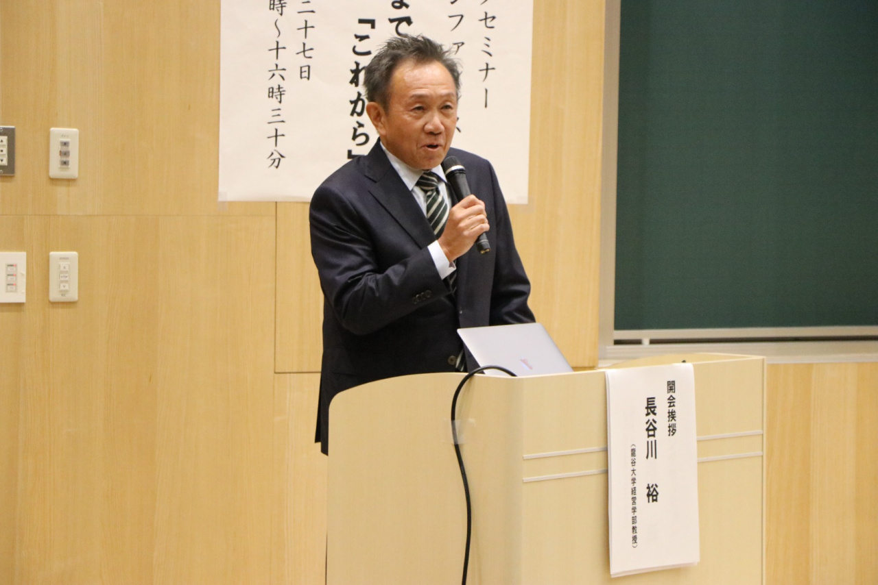 まず初めに本学トレーニング室体制を構築した長谷川裕龍谷大学経営学部教授より、本学トレーニング室体制を整備してきた背景や経緯、および各講師のご実績などを紹介させていただきました。