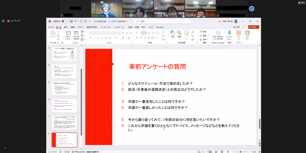 最後に、岩尾 一史教務副主任から、「卒論を書くのはみんな初めてで、どういうものかわからないので大変だと思うが、みんな1年かけてなんとか出してくる。その過程をこうやって先輩から聞くことができてよい機会になったと思う。」との講評をいただきました。