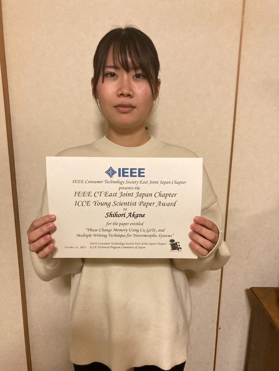 電子情報学科卒業生の赤根 詩穂里さん(指導教員:木村睦教授)の研究「Phase-Change Memory Using Cu2GeTe3 and Multiple Writing Technique for Neuromorphic Systems」が、「IEEE CT East Joint Japan Chapter ICCE Young Scientist Paper Award」を受賞。