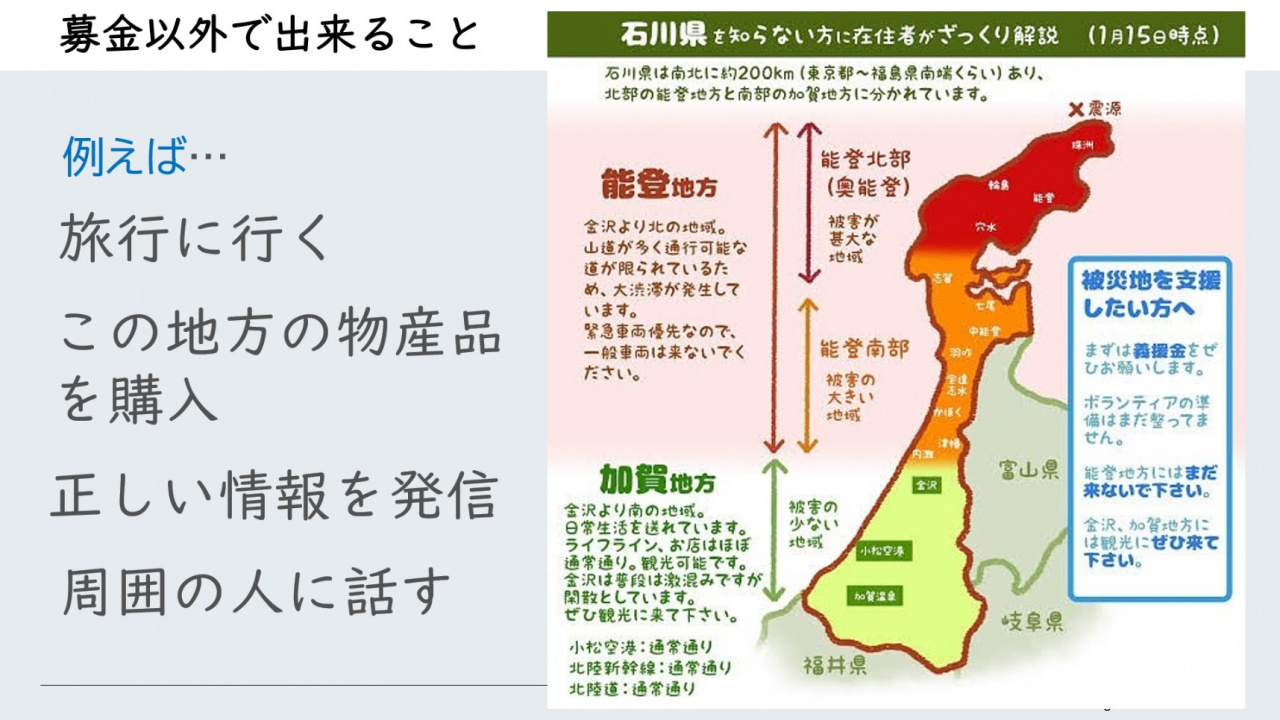 ・本日の講座を聞いて、ボランティアに行くことも大切だけどボランティアに行かずとも被災地を支援できるとわかった。しっかり状況を判断しながら災害ボランティアに参加したいと思った。