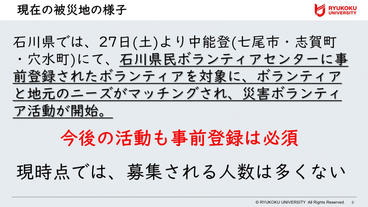 学生ボランティアの力が発揮できるまでは、もう少し時間が必要です。被災地域の情報は刻一刻と変わるため不確定要素が多く、現時点では「これをしよう!」という発信は難しいですが、一時の興味ではなく「関心を持ち続けること」を今後も学生に伝えてまいります。