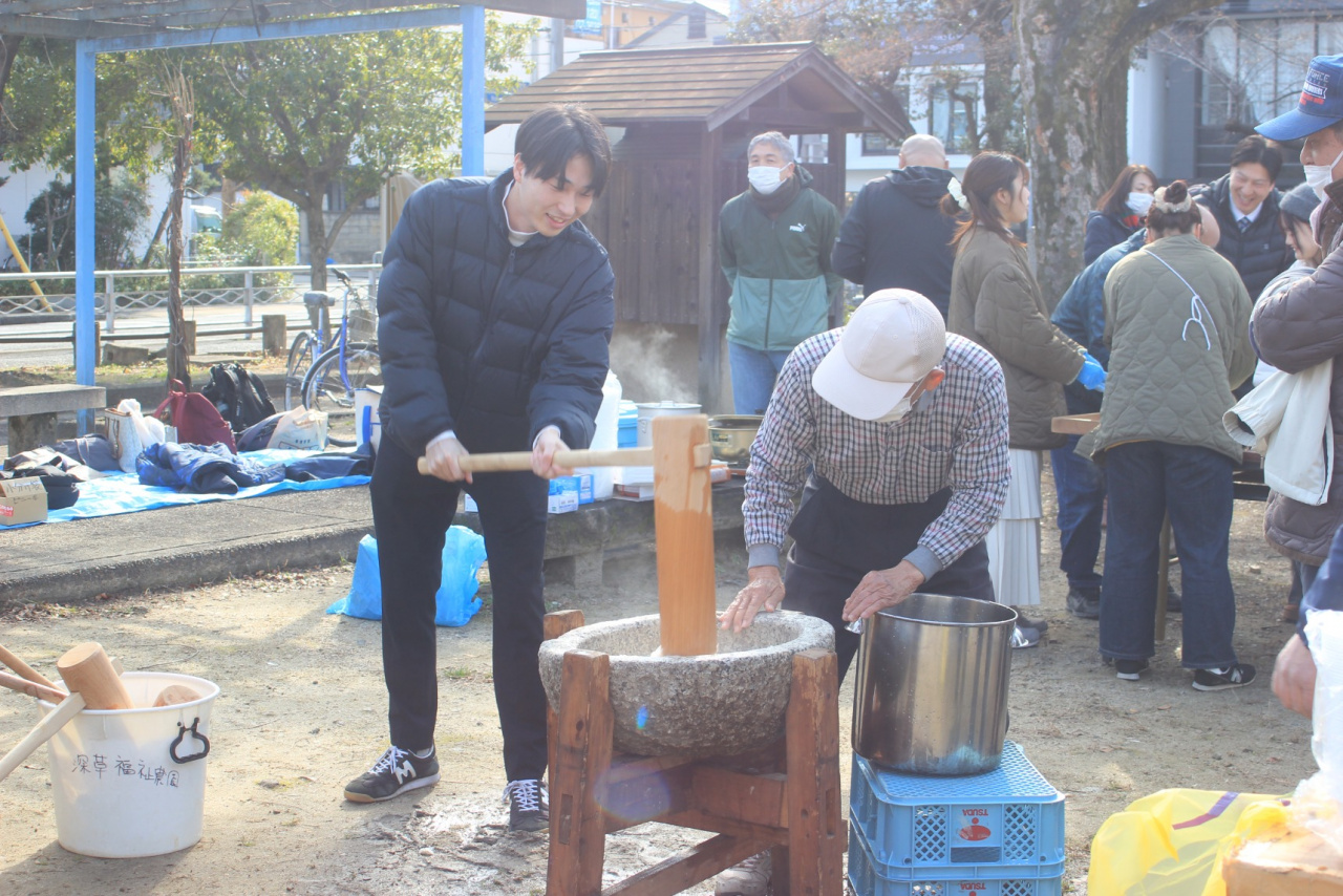 4年ぶりの開催とあって、地域の方々も大喜びされていました。つきたてのお餅や、豚汁、甘酒がふるまわれました。子どもたちや、龍谷大学、JCL日本語学校(Japan China Line)の留学生、地域で暮らす外国人の方々も参加され、大盛会でした。両ゼミの学生たちも準備からお手伝いさせていただきました。会場の設営をしたり、道具の準備や豚汁を作ったりしながら、作業を通じて少しずつ住民の皆さんと打ち解けられたのではないかと思います。