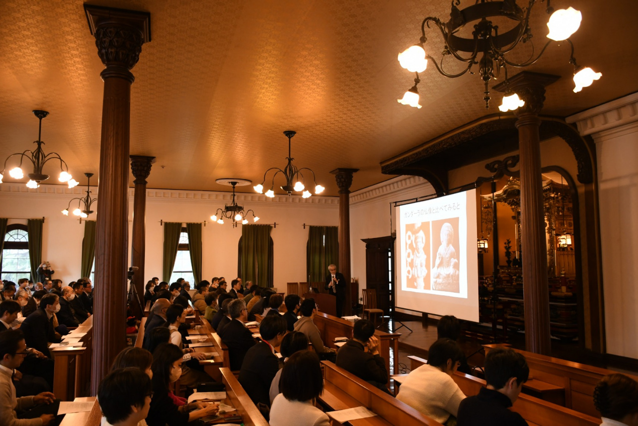 最終講義では「仏教の流伝」と題してご講義いただきました。その内容は、先生のフィールドワークの出発点ともいえる「仏教初伝南方ルート調査」に始まり、自ら隊長を務められた「龍谷大学アフガニスタン学術調査」、そして、各国探検隊の足跡を追いつつ失われた歴史の現代的復元を目指した「ベゼクリク石窟壁画高精細デジタル復元事業」についてなど、多岐にわたるものでした。仏教を媒介とした東西交流の様相を、ご自身の豊富な体験を盛り込みながらエネルギッシュにお話しくださいました。まさに、入澤先生の西域仏教文化研究に捧げた半生を振り返るようなご講義でした。