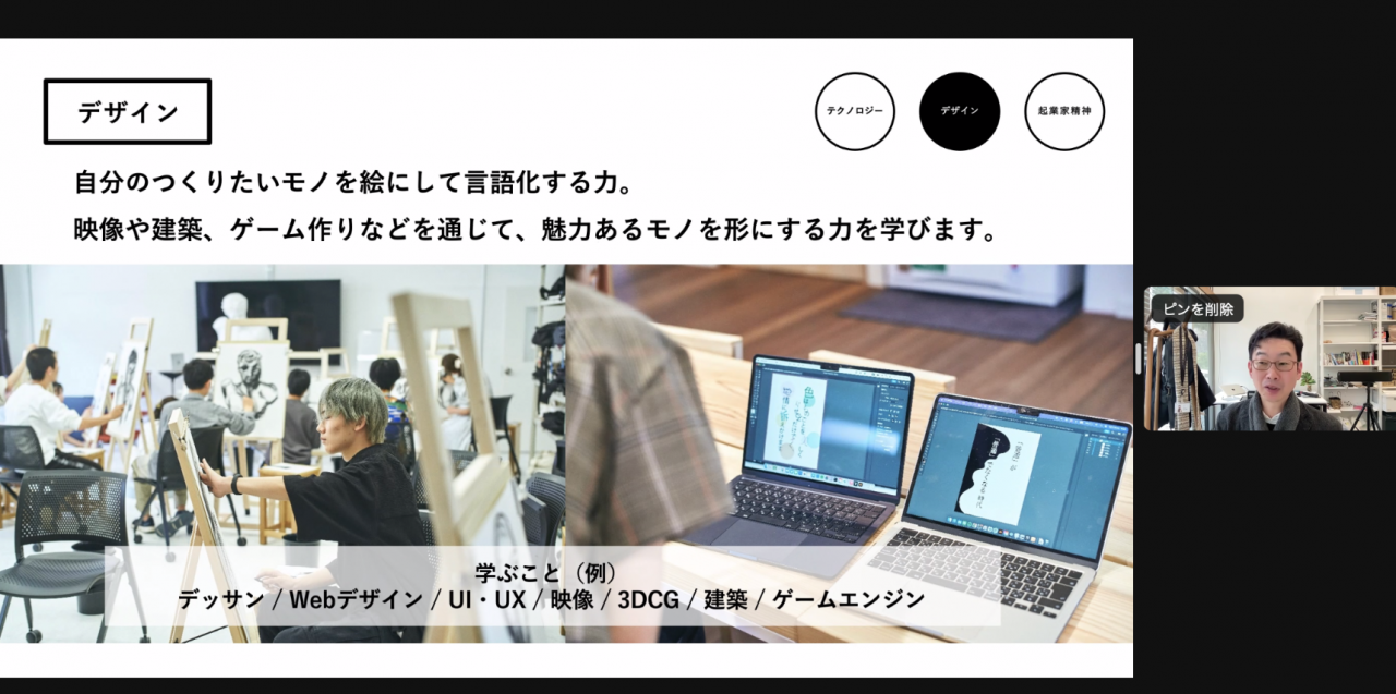 最初に、神山まるごと高等専門学校デザイン・エンジニアリング学科佐野淳也准教授から、「テクノロジーとデザインで人間の未来を変える学校〜神山まるごと高専の挑戦」と題して講演をいただきました。そのあと1期生の名和真結美さん、金谷尚興さん、鈴木カヲルさんから、それぞれが取り組んでいるマイプロジェクトについて紹介がありました。