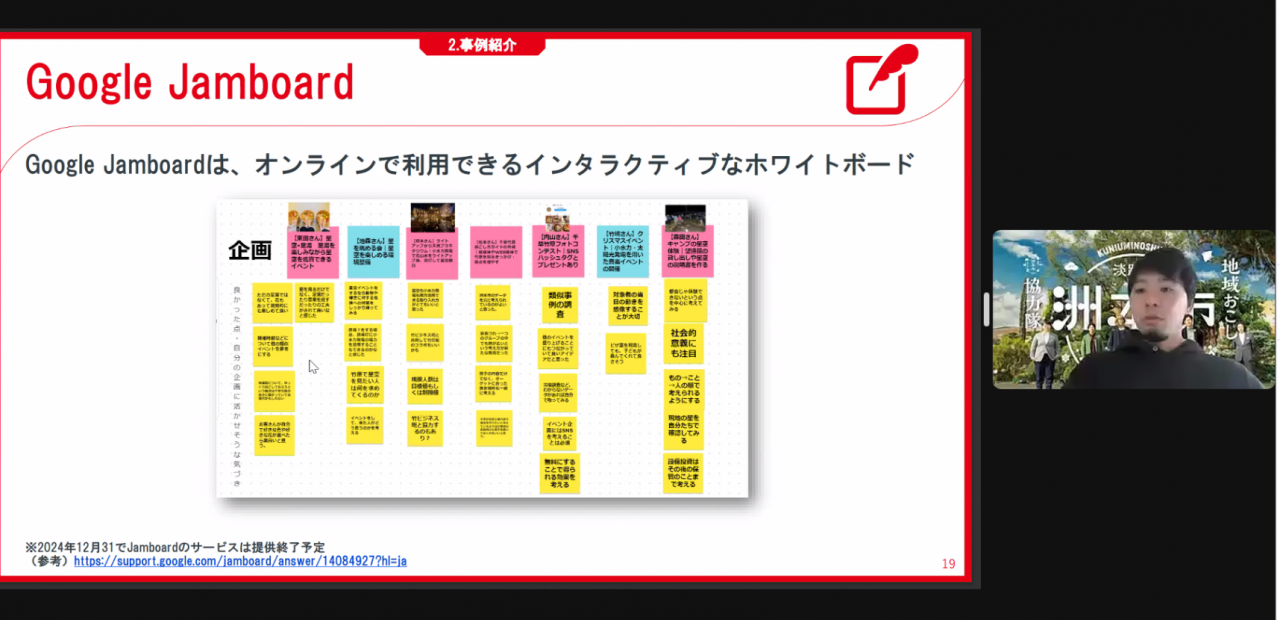 小林氏は2021年地域おこし協力隊員に着任、地域と大学生のプロジェクトを支援してきました。IT企業でシステム開発に携わった経験を活かし、Google Maps、Zoom、Loom、LINE、Jam boardなどのツールをプロジェクトに取り入れています。対面とオンラインの両方を使い分け、遠隔地コミュニケーションを豊かにする方法を紹介しました。