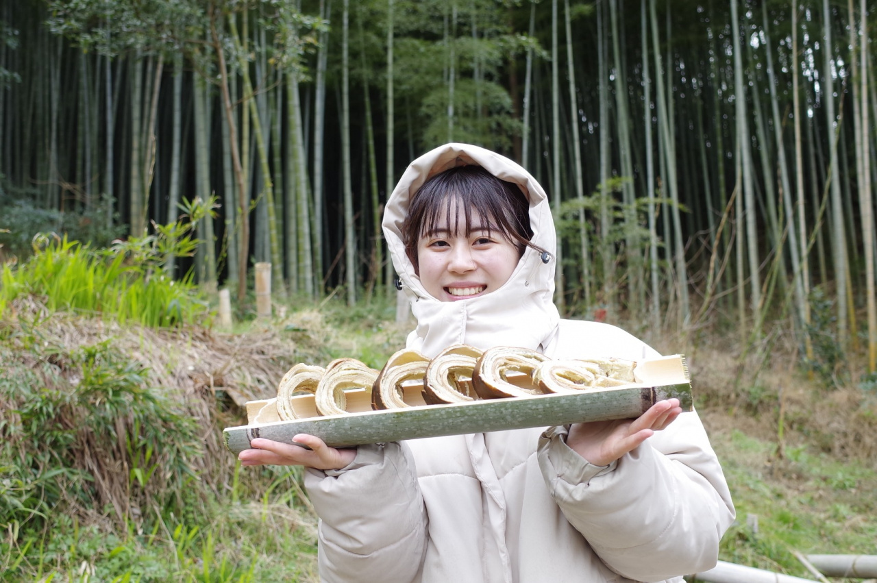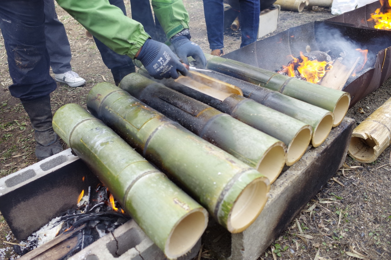 翌日は洲本市安乎町の竹林で、あわじ里山プロジェクトの辻さんに教わりながらバンブークーヘン、炊飯、皿を作りました。塔下新池班が企画している「地産地消キャンプ」は、地元の食材やものを使う内容で、バンブークーヘンもその一つです。