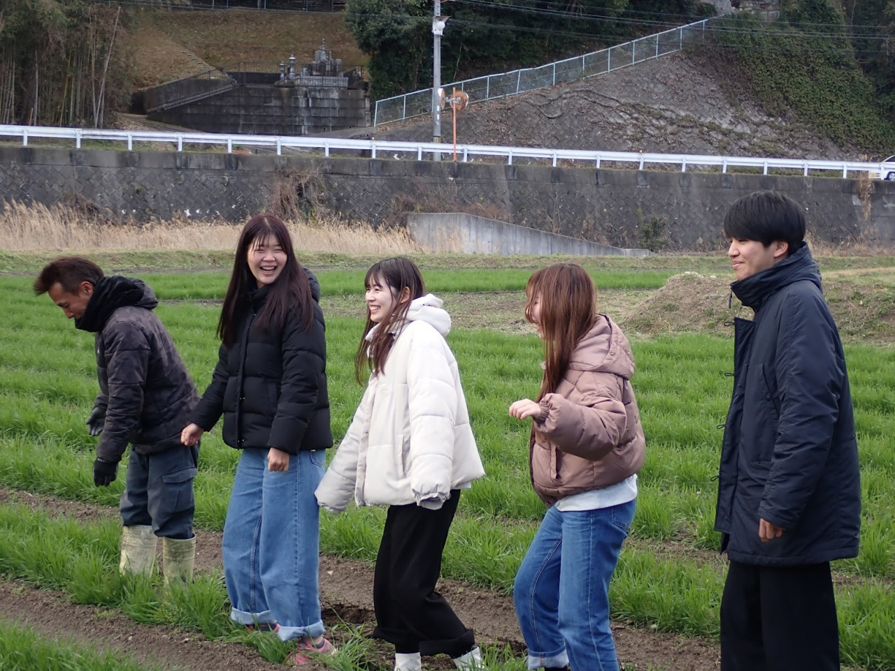 次に塔下に移動し、鮎原塔下集落営農組合の麦畑で麦踏み体験をしました。前日の雨のため、畑がぬかるんでおり、足を取られる場面もありましたが、貴重な経験となりました。この麦は、6月に収穫予定でパスタへの加工を予定しています。