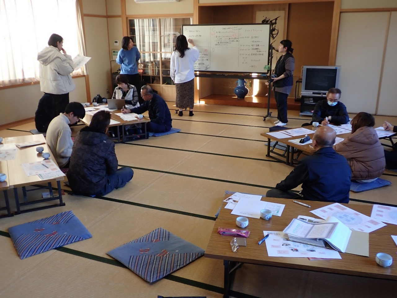 最後に、塔下公会堂で営農組合や企業の方々と塔下の未来図について考えるワークショップに参加しました。4つのグループに分かれ、域内と域外にある資源をどう組み合わせていくか、アイデア出しをしたうえで、将来の取り組みについて意見交換を行いました。島の食材を持ち寄ったフードフェスや菜の花フォトスポット、先山千光寺元旦歩こう会など、様々な意見が出されました。