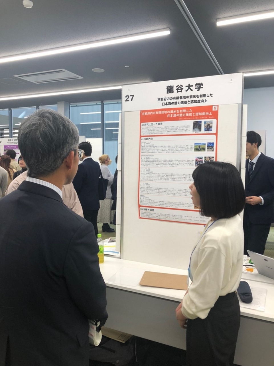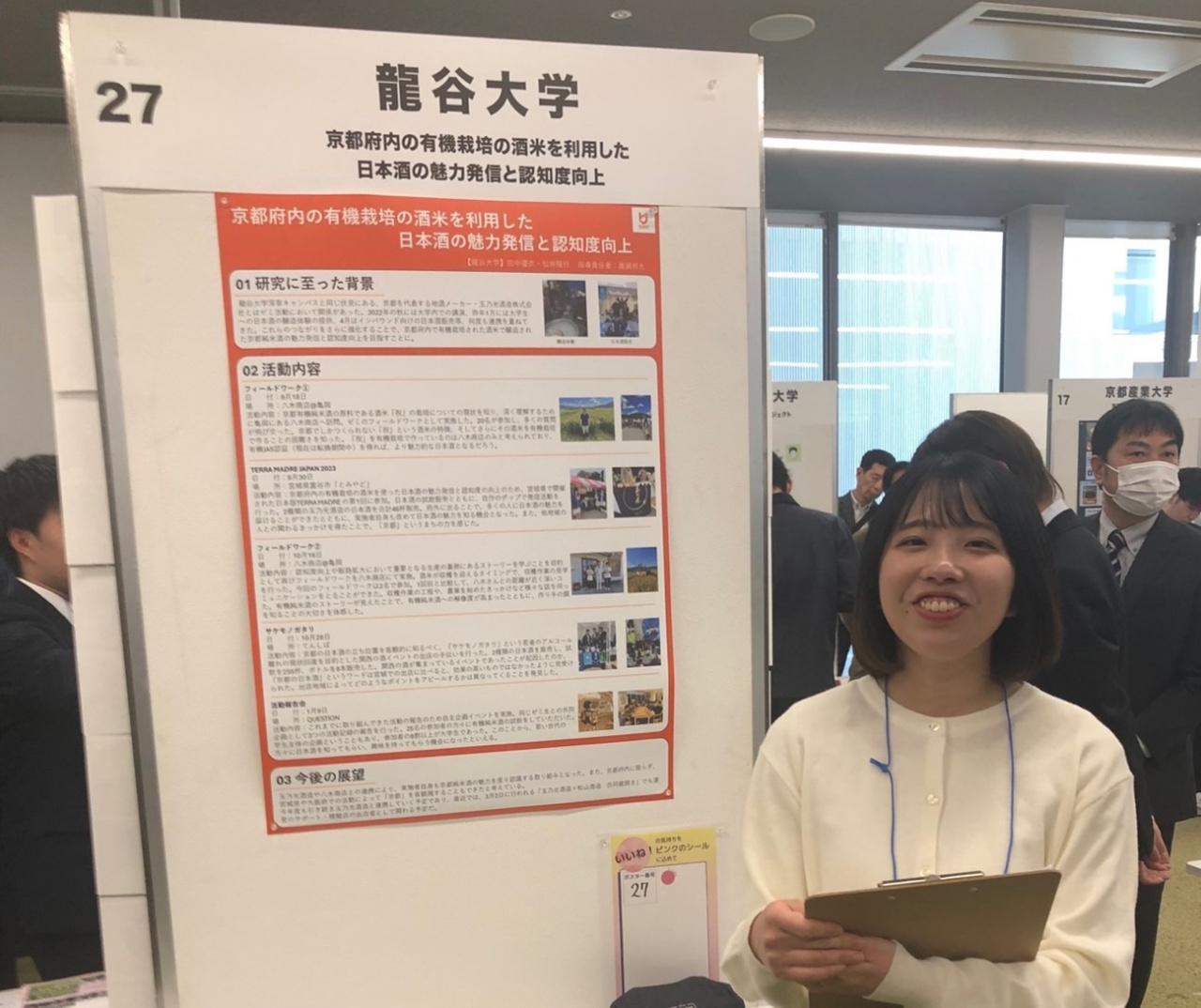 眞鍋ゼミは,「京都府内の有機栽培の酒米を利用した日本酒の魅力発信と認知度向上」というテーマで,伏見の酒造会社や京都府亀岡市の農業者と連携し、府内の農業・農村および伝統的食品産業の現状を理解するとともに、地域内外の若年層を対象としたイベントの参加や自主企画の開催を通じて、府内で有機栽培された酒米で醸造された京都純米酒の魅力発信と認知度向上を目指す取組を行ってきました。