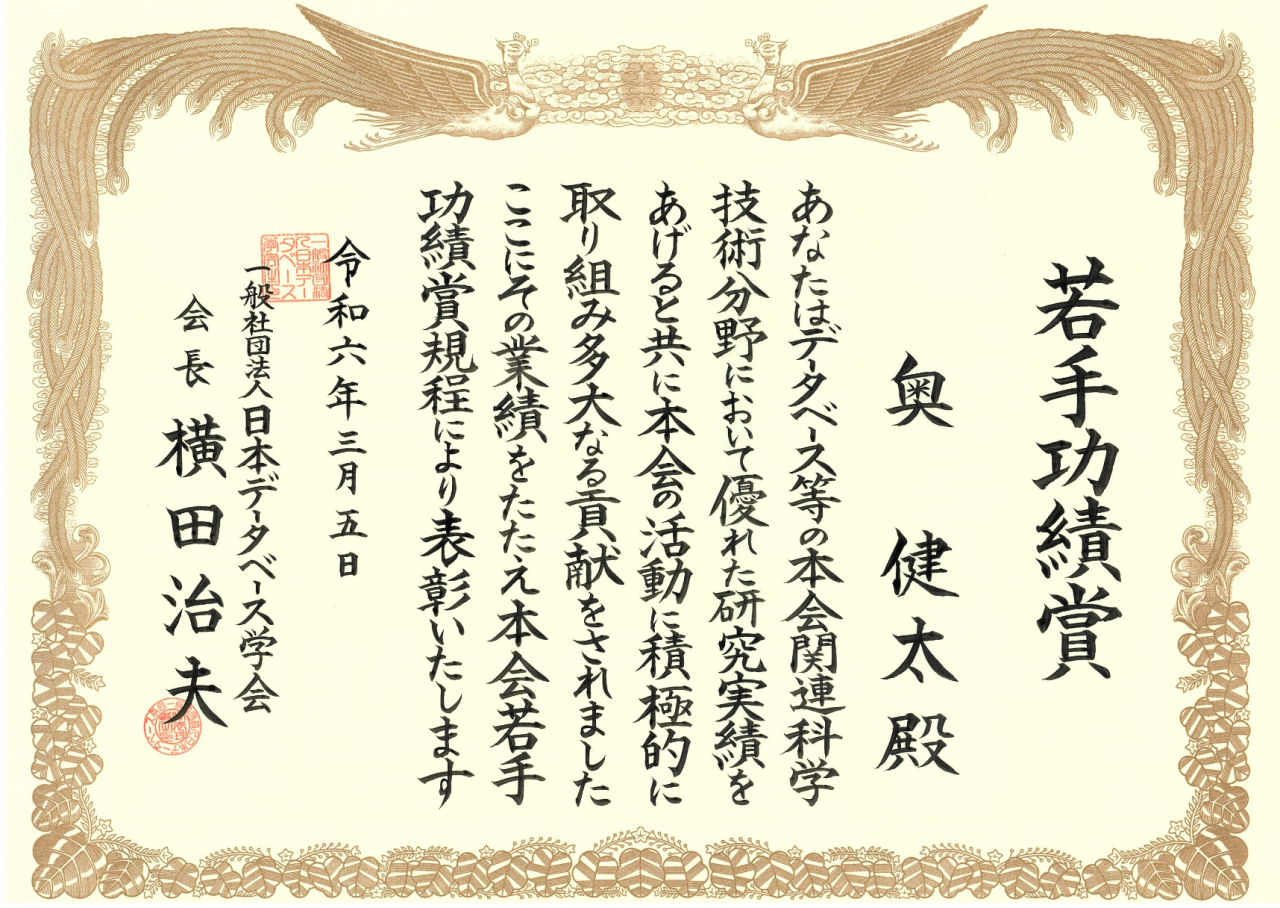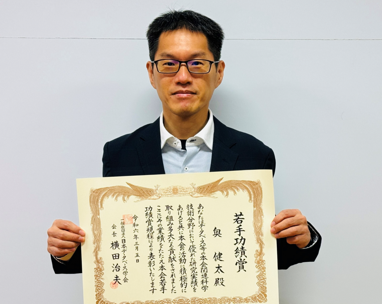 知能情報メディア課程の奥 健太 講師が、日本データベース学会から「若手功績賞」を授与されました。
