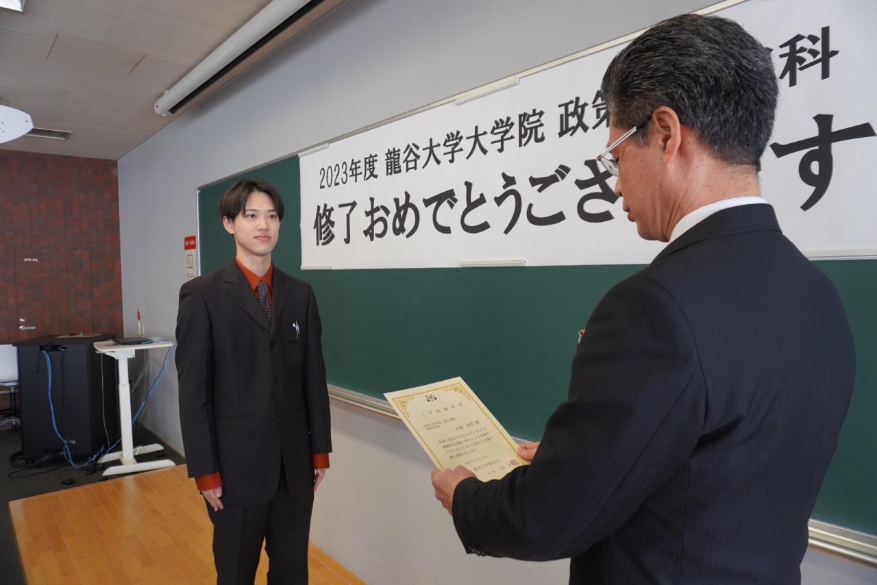 3月16日(土)、深草学舎にて2023年度学位記、修了証書授与式を実施しました。修了生は博士後期課程1名、修士課程18名で、ひとりひとり、学位記が中森研究科長より授与されました。